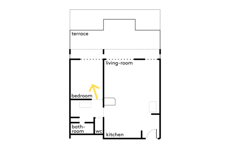 La chambre, orientée au nord-ouest, bénéficie de la lumière de fin de journée et d’une jolie vue sur la terrasse.