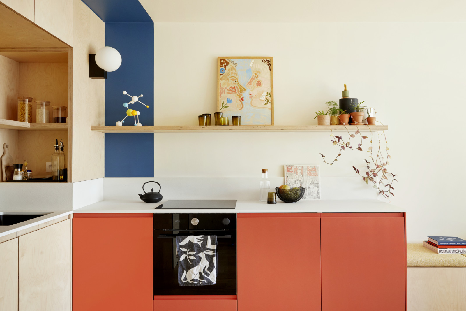 En plus d’établir une séparation avec la cuisine qui lui est contiguë, elle donne le ton de l’appartement qui foisonne d’espaces d’exposition.