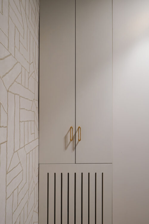 De retour dans l’entrée, les rangements sur mesure organisent l’espace : placards toute hauteur et niches ouvertes qui rappellent subtilement celles de la salle d’eau, alliant fonctionnalité et continuité esthétique.