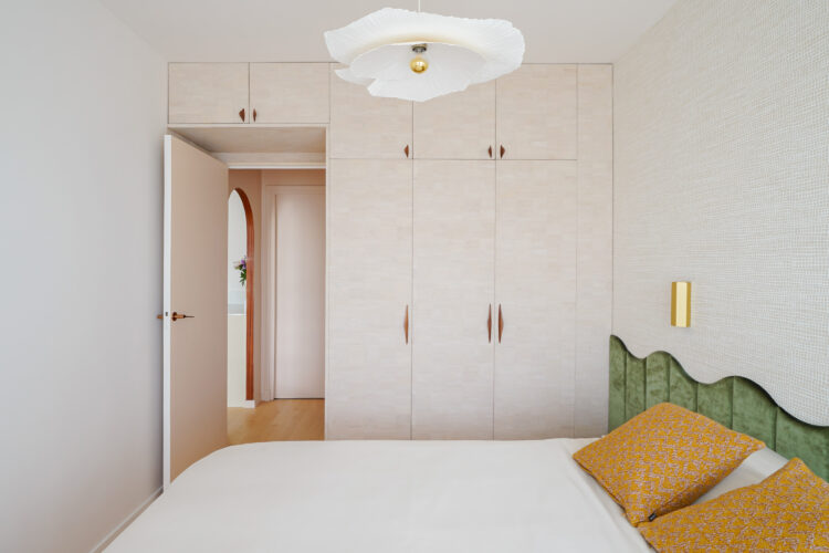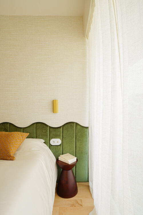 La tête de lit en velours vert ondule doucement le long d’un mur texturé, tandis que la lumière tamisée en souligne subtilement les courbes, créant une atmosphère propice à la rêverie.