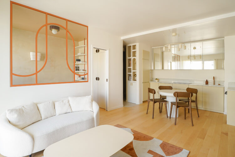 Côté salon, l’Atelier 428 explore une écriture géométrique ponctuée de références vintage. Une verrière aux motifs courbes graphiques sépare la pièce de vie de l’ancienne cuisine, transformée en bureau.