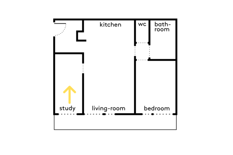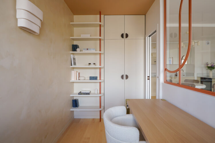 Ouvert sur la pièce à vivre, le bureau intègre de nombreux rangements, alternant éléments ouverts et fermés. La menuiserie laquée orange de la verrière fait écho à celle de l’étagère, contrastant subtilement avec la texture veloutée du mur enduit à la chaux. Les teintes chaudes de la verrière dialoguent également avec celles du plafond ocre, créant une atmosphère enveloppante.
