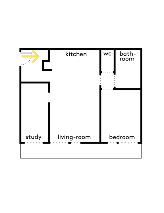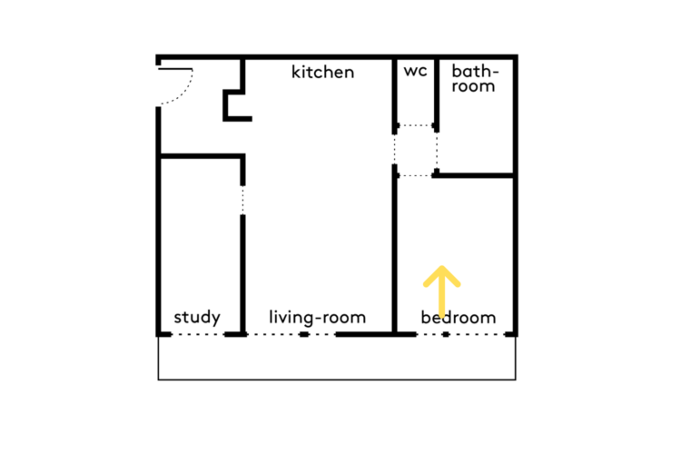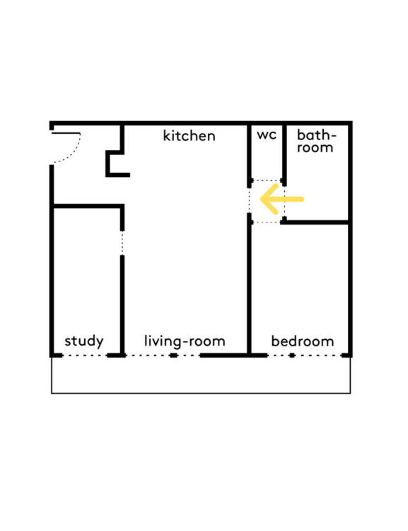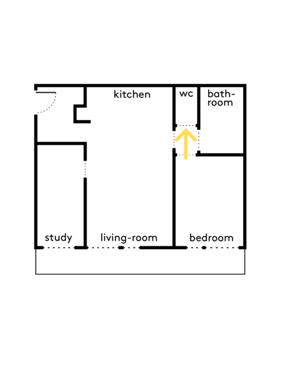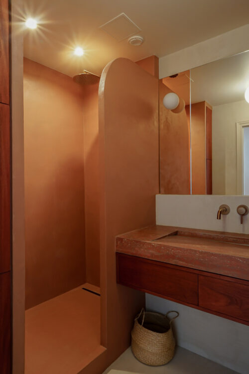 La salle d’eau évoque les intérieurs marocains, avec des murs enduits dans des tons ocre. La paroi courbe de la douche reprend les lignes ondulantes présentes dans le reste de l’appartement, créant une continuité harmonieuse et douce.