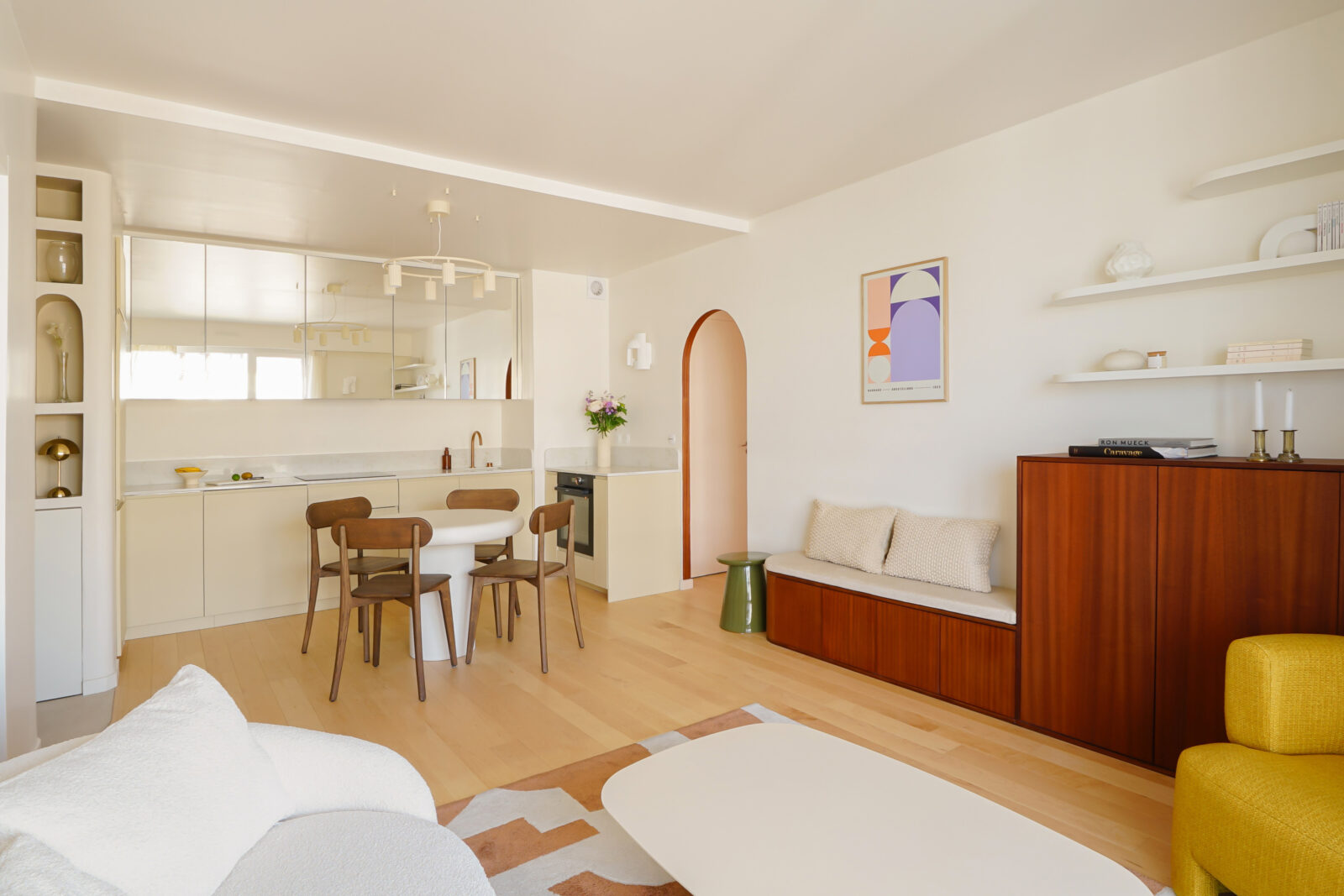 Entièrement modernisé, l’appartement a été repensé pour offrir plus de confort et une organisation des espaces adaptée aux usages contemporains. La rénovation a inclus une mise à niveau complète des installations techniques et une redistribution des volumes, donnant naissance à une grande pièce de vie ouverte combinant cuisine, salon et salle à manger.