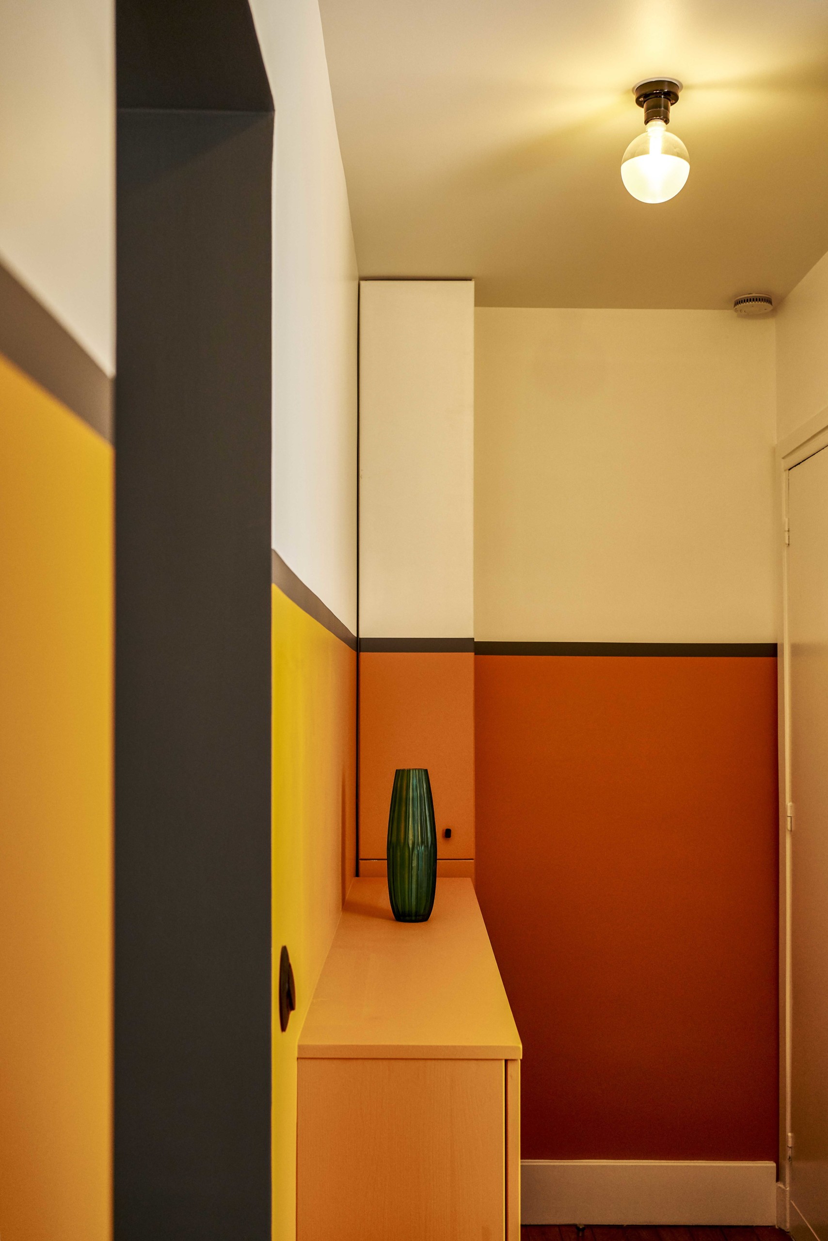 Dans l’entrée, le ton est donné avec cette cimaise haute, peinte en orange lumineux ! Un bandeau gris anthracite fait office de fil conducteur avec le séjour.