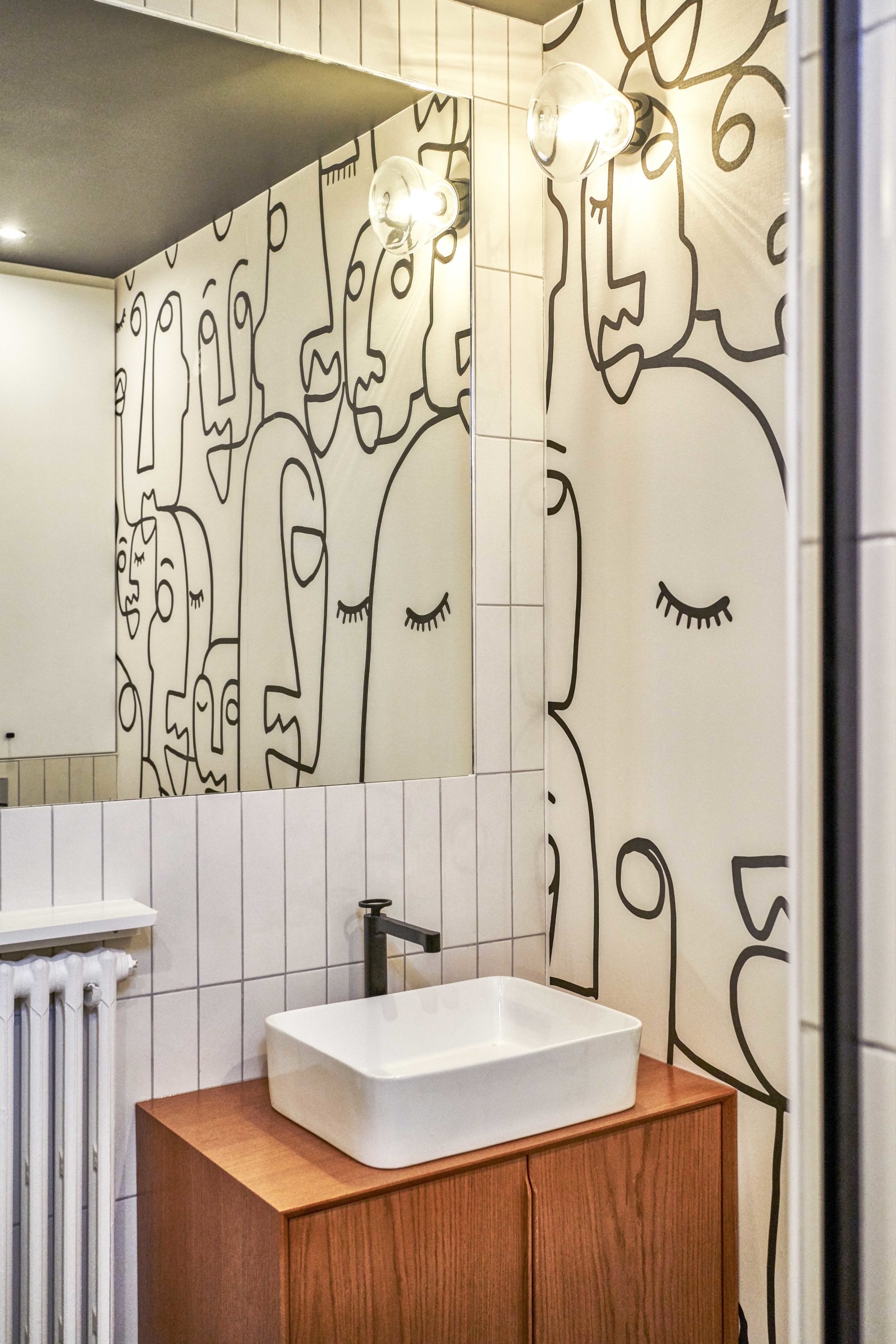 La salle de bain est la seule pièce monochrome. Elle est pourtant loin d’être monotone avec son papier peint à visages et son carrelage rectangulaire posé à la verticale !