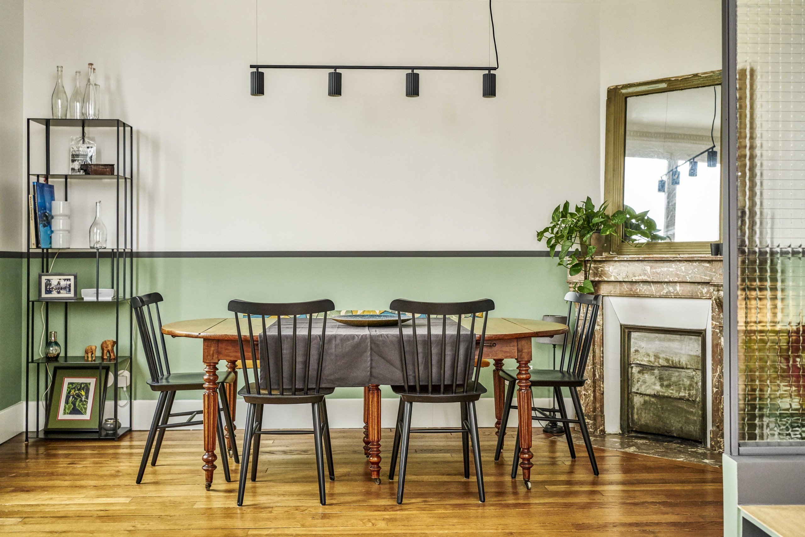 Puisque chaque pièce a sa teinte, c’est un vert doux qui habille les murs de la salle à manger, avec le même procédé de cimaise pour assumer la couleur tout en subtilité !