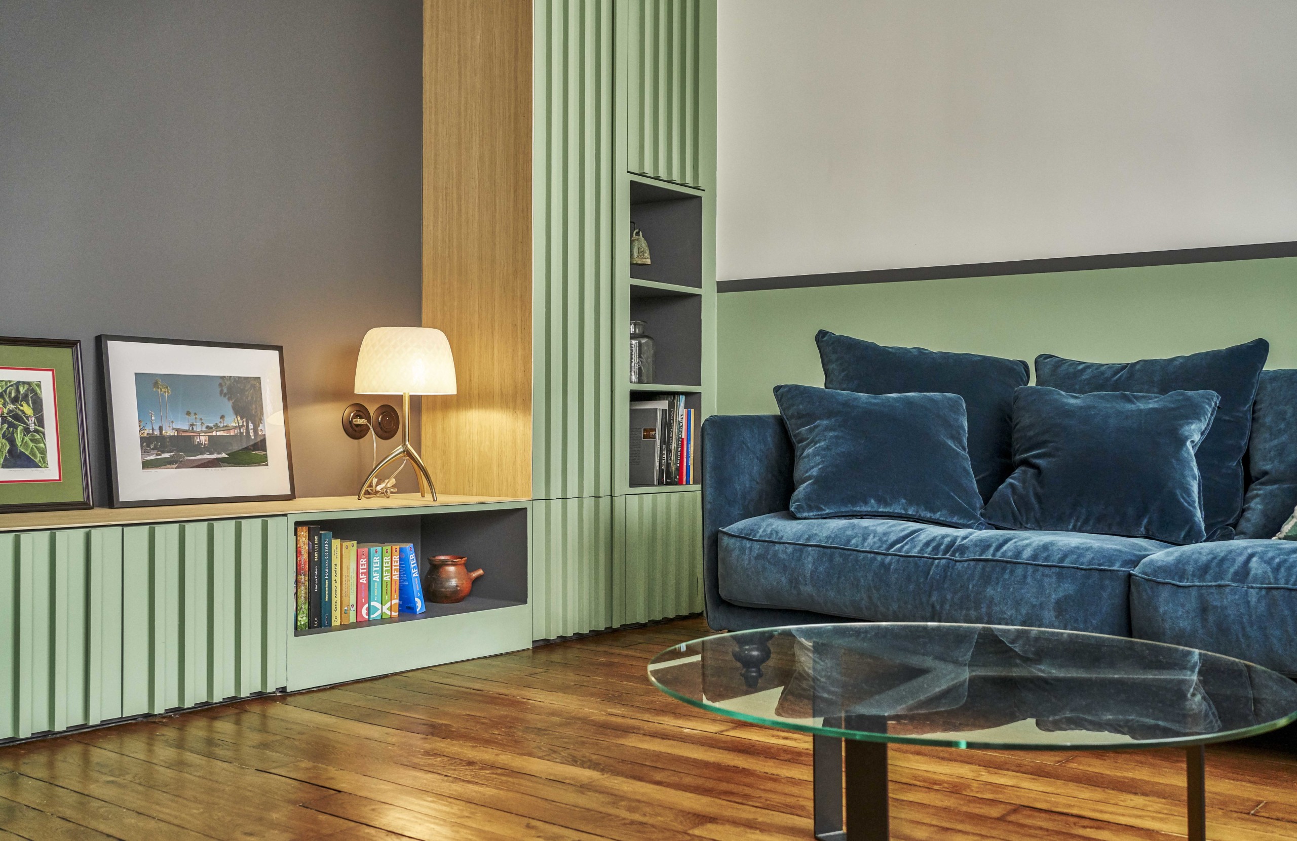 Dans le salon se dresse un module de rangement encadrant une niche XXL, réalisé sur-mesure et couvert de portes à tasseaux pour donner du relief à l’ensemble.