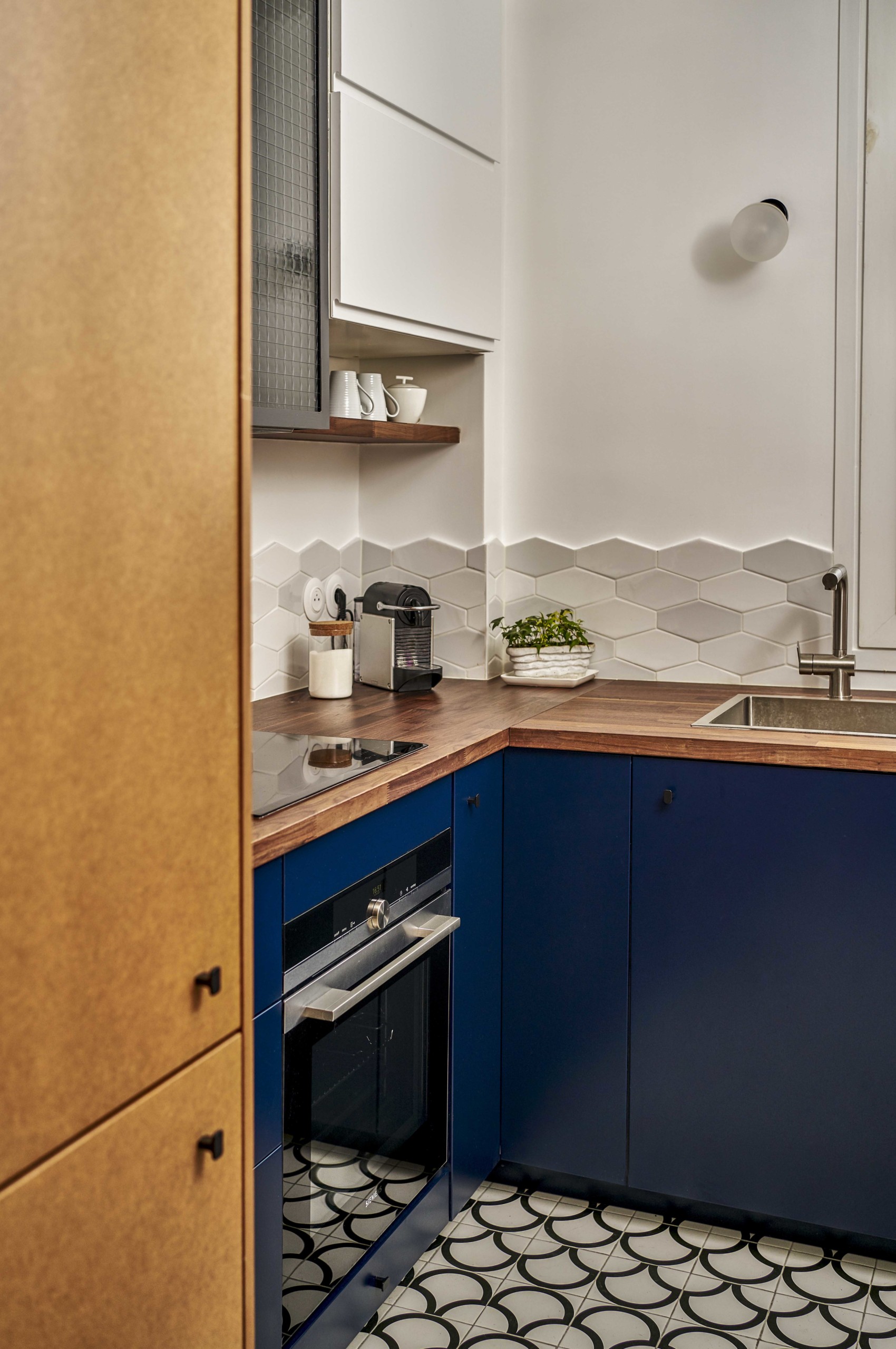 On ose aussi le carrelage géométrique à motif écailles qui opère une transition fluide entre la cuisine et l’entrée.