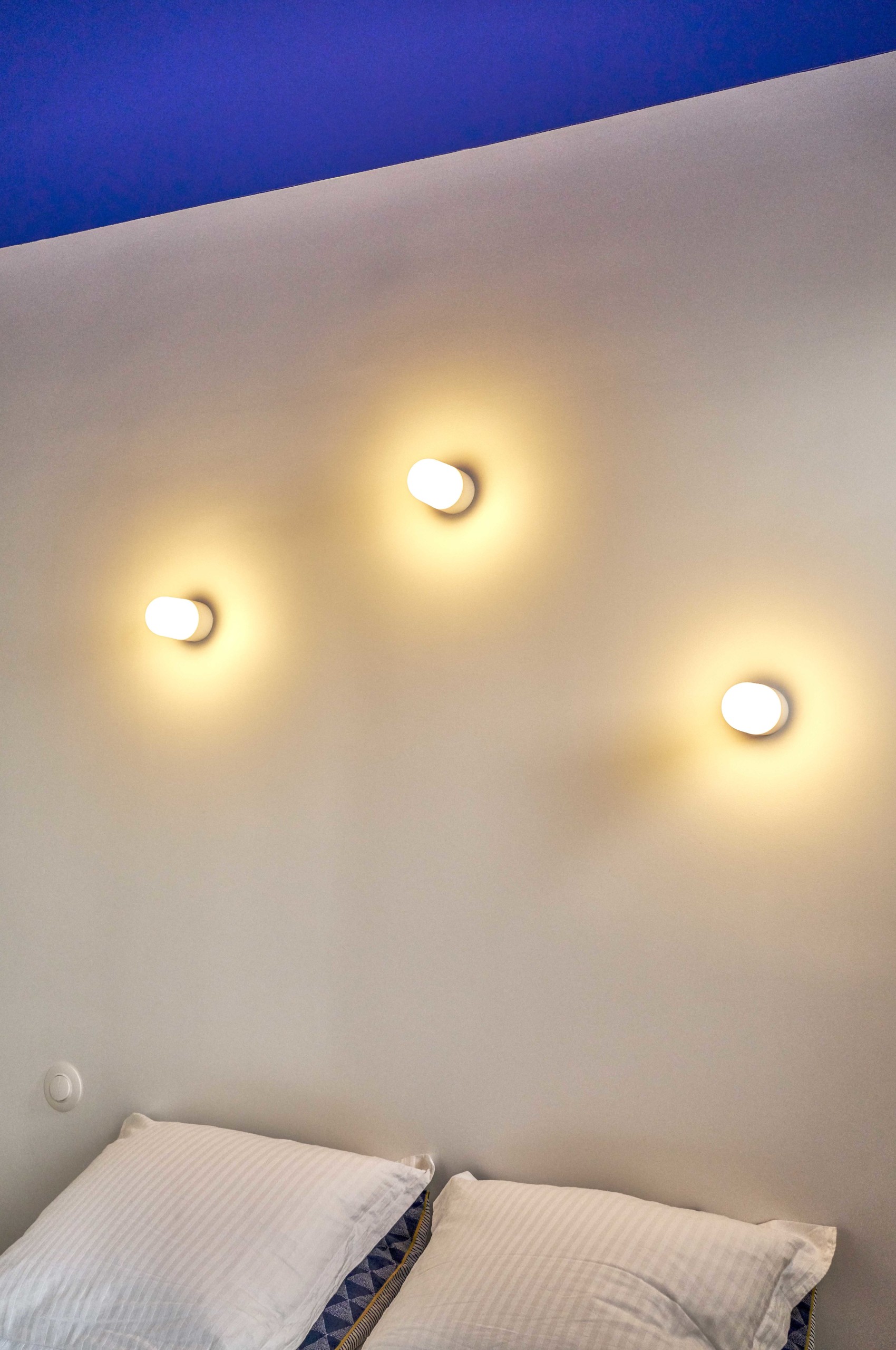Dans cette pièce, on assiste à une inversion des conventions déco : les murs restent blancs et le plafond est peint en bleu Klein. Avec une constellation d’appliques !