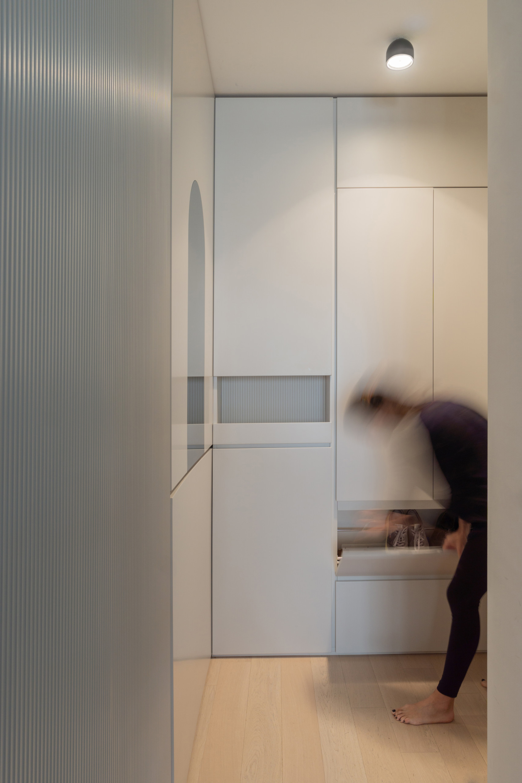 Le ton est donné dès l’entrée : pas un cm² de perdu avec ces rangements multiples et toute hauteur.