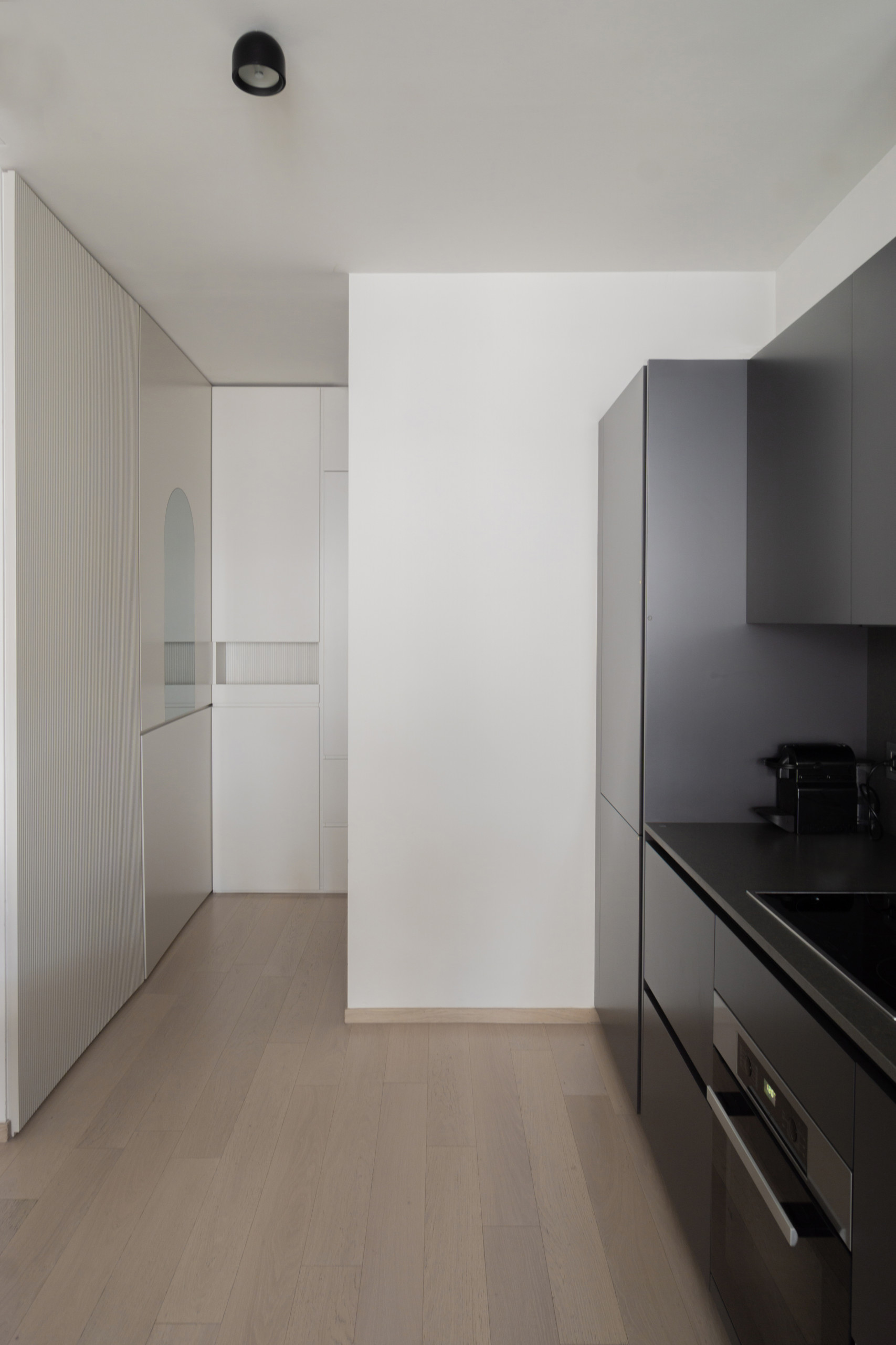 Les panneaux de bois striés ou laqués y créent d’élégantes géométries ton sur ton. Même principe pour la cuisine, mais dans une teinte noire au contraste assumé.