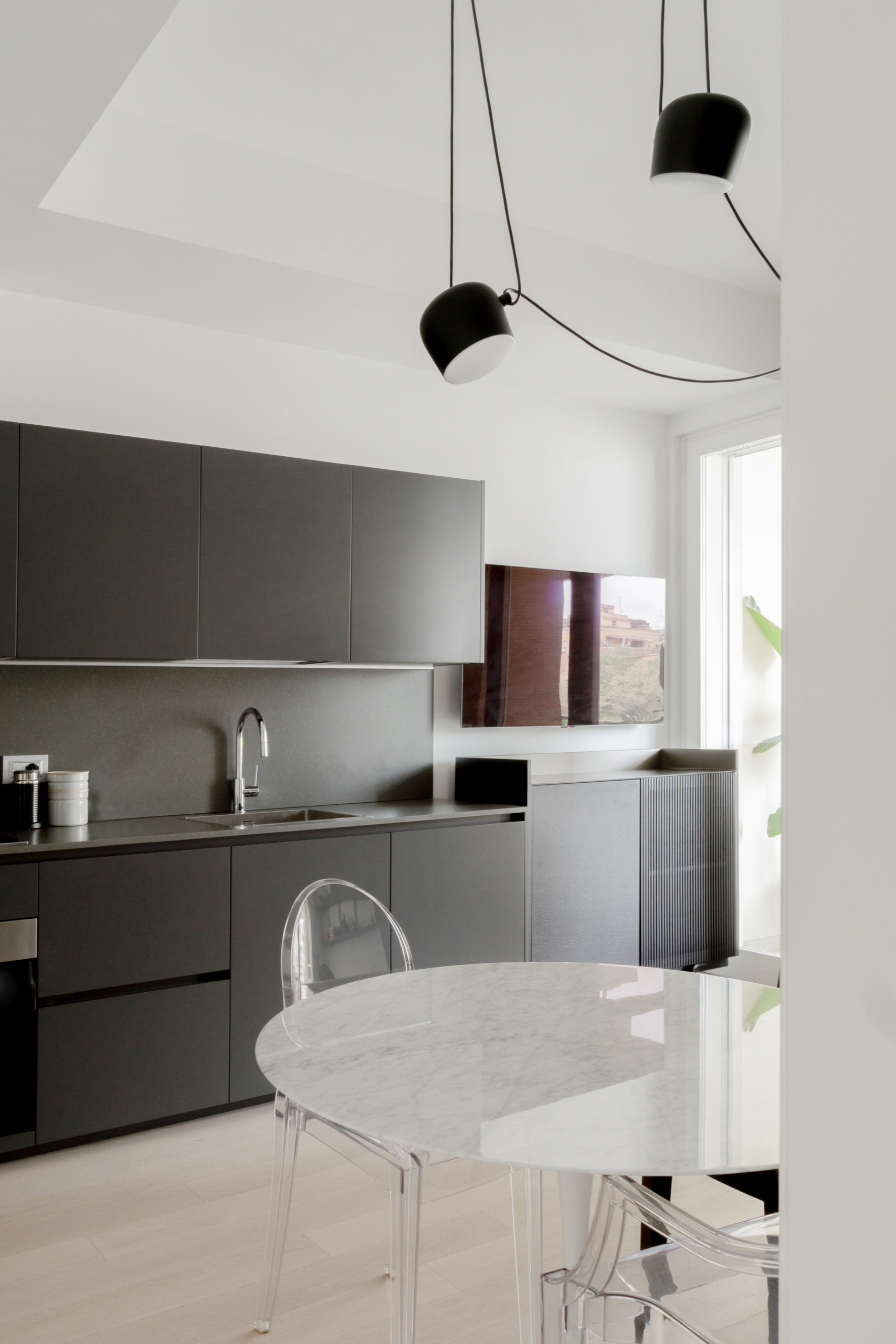 Un intérieur épuré, prêt à mettre en scène les objets du quotidien. Zoom sur le plateau de la table en marbre de Carrare, touche chic et intemporelle.