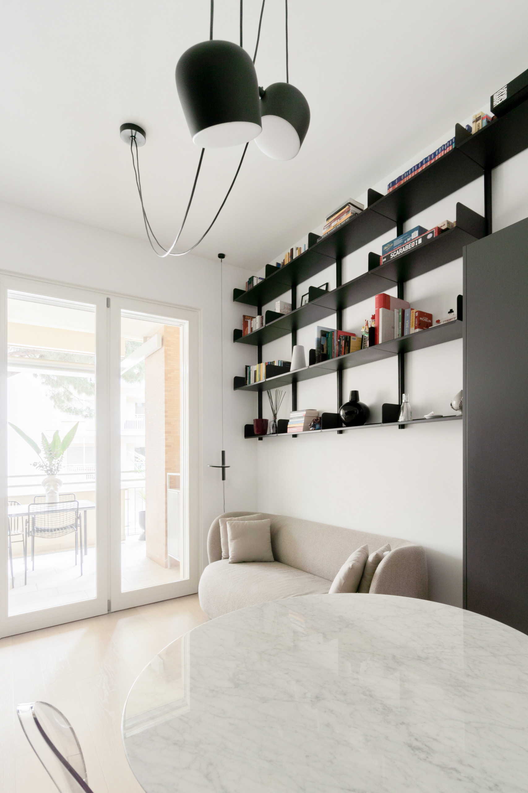 Le jeu de contraste se poursuit par petites touches aériennes, comme la bibliothèque et la suspension. Passons la porte-fenêtre…