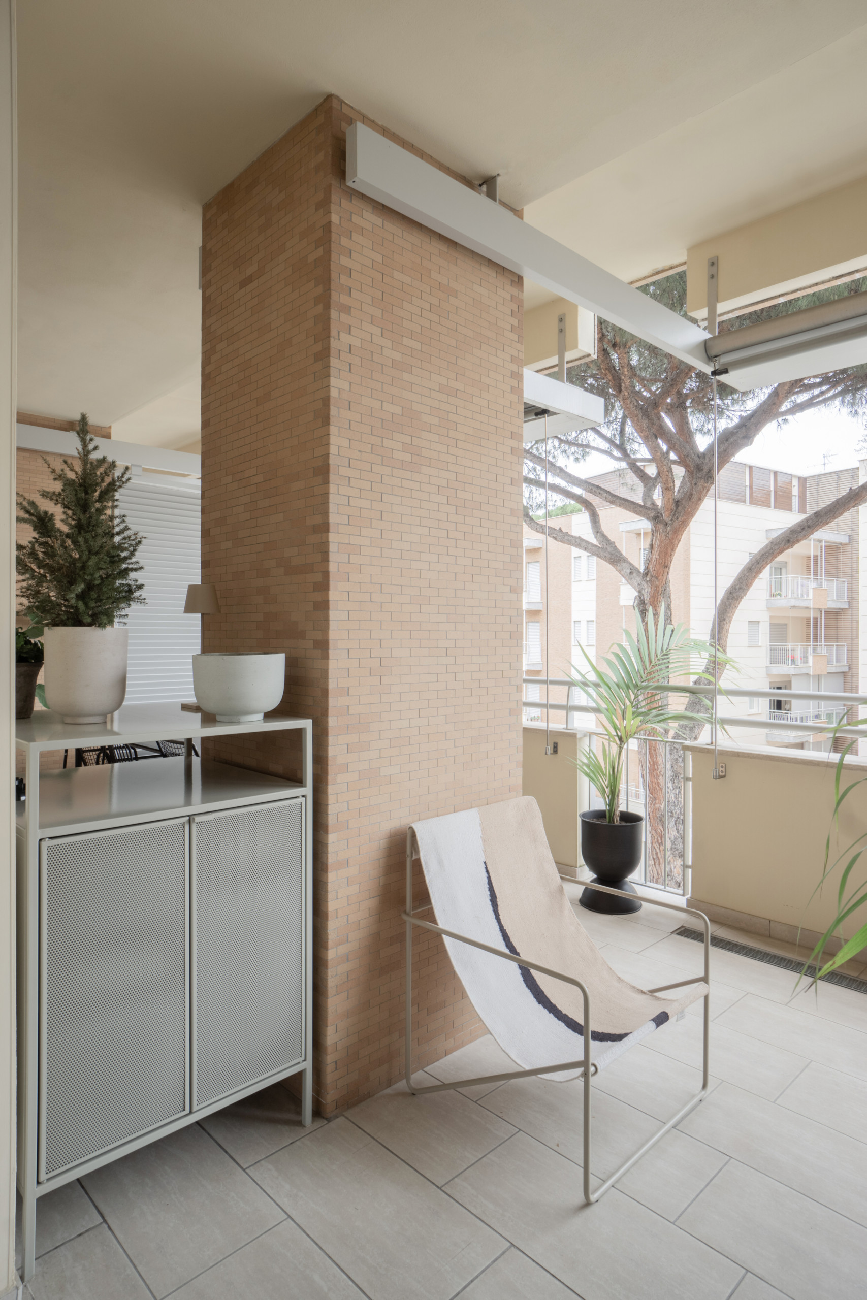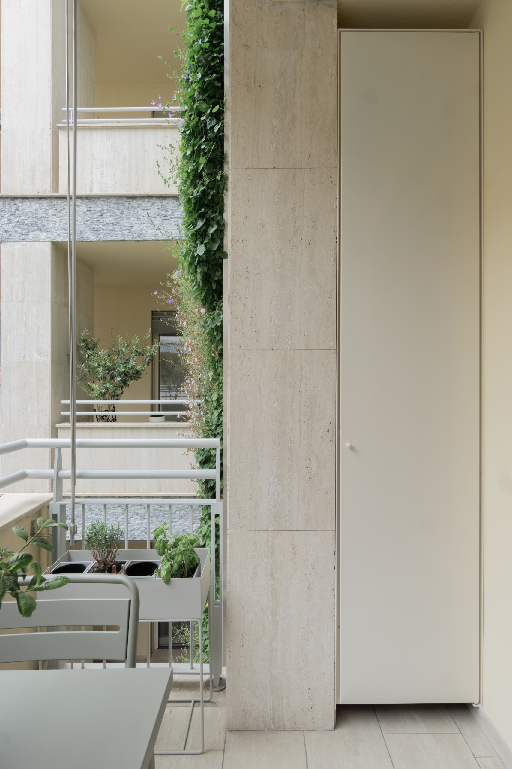 Et même ce petit balcon peut se targuer d’offrir un rangement, qui plus est, élégamment dissimulé !