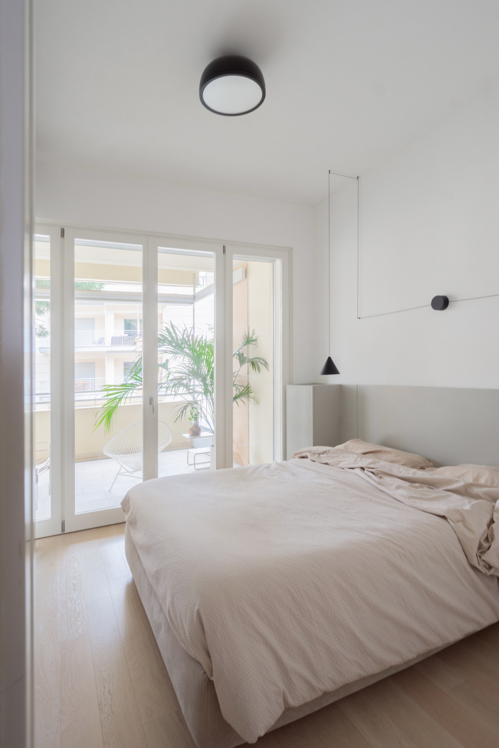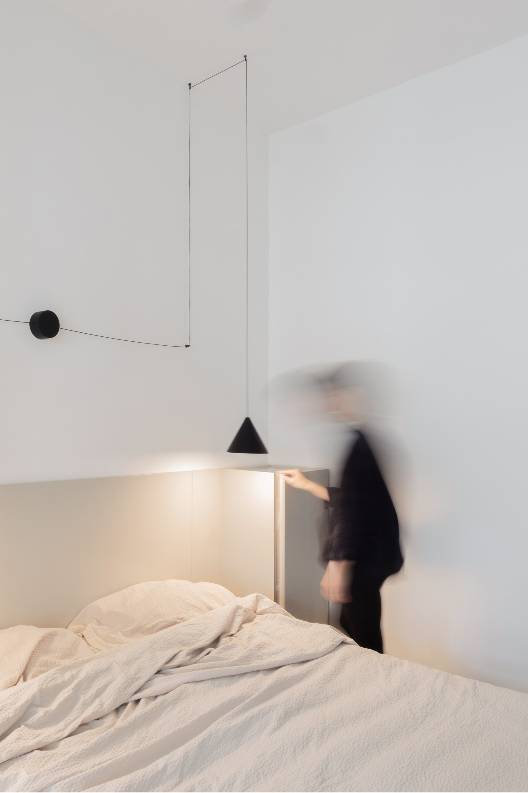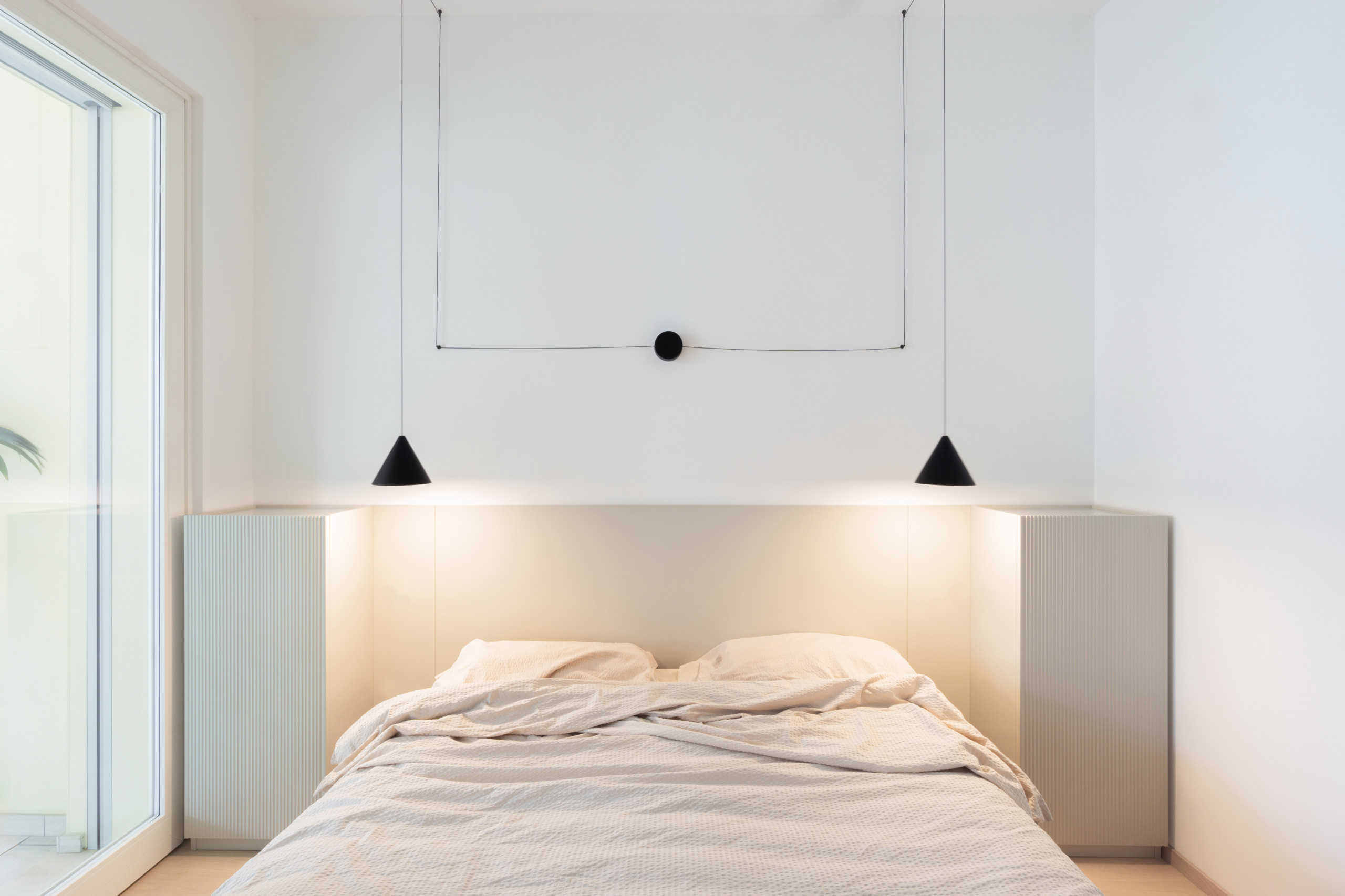 La tête de lit vient encadrer le couchage avec deux colonnes-chevet. L’ensemble est coiffé de la suspension iconique créée par Michael Anastassiades pour Flos.