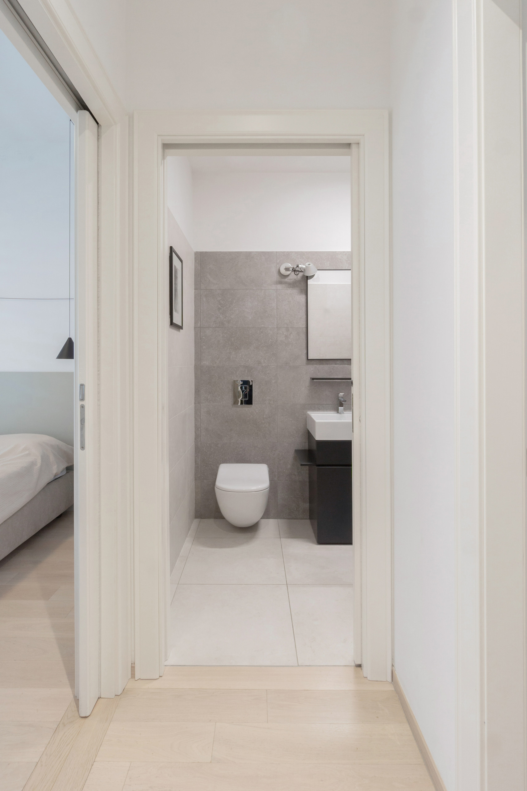 Un coup d’œil en direction de la salle d’eau. Son carrelage en grès cérame effet pierre naturelle prolonge l’ambiance minérale et épurée.