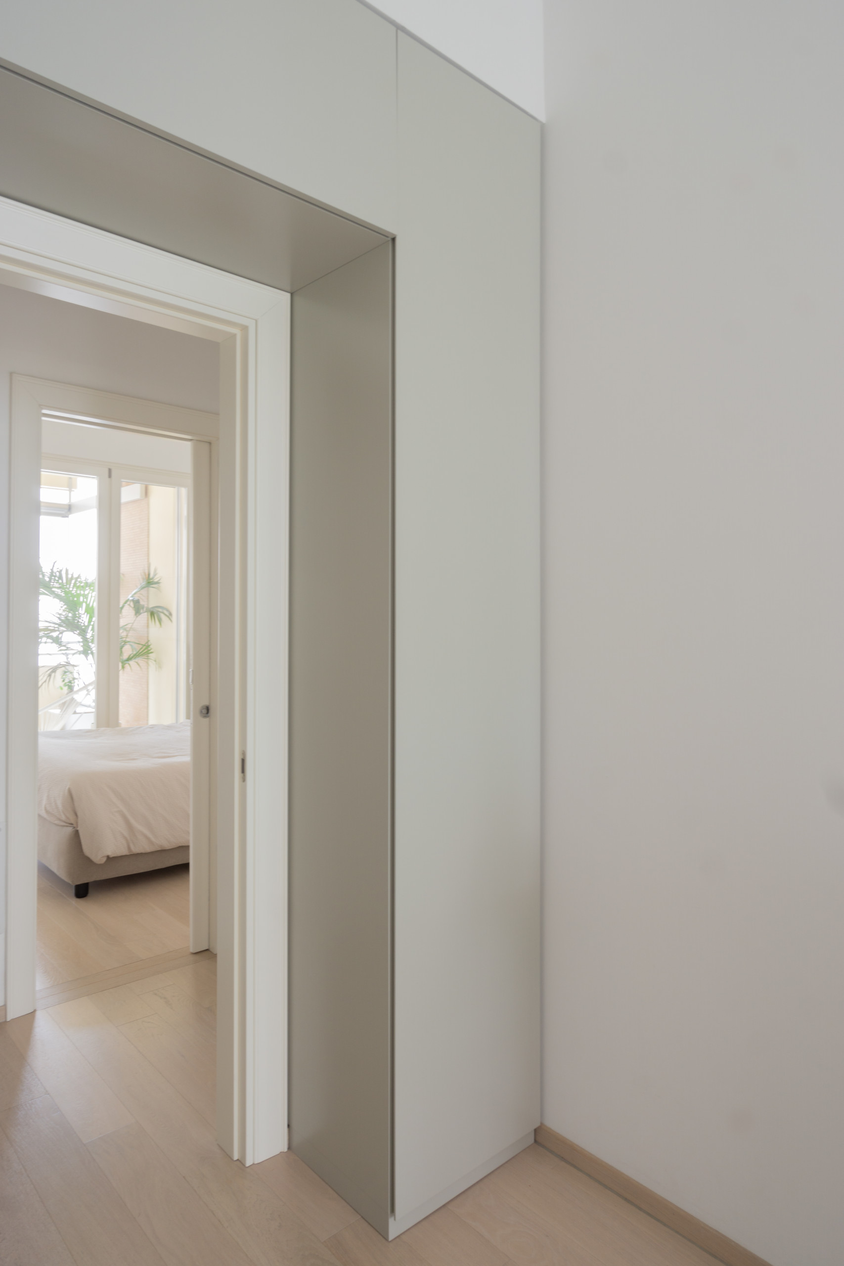 Place à la chambre principale, donnant elle aussi sur la terrasse. Les couleurs suaves du parquet en chêne naturel et des murs rendent l’espace très apaisant.