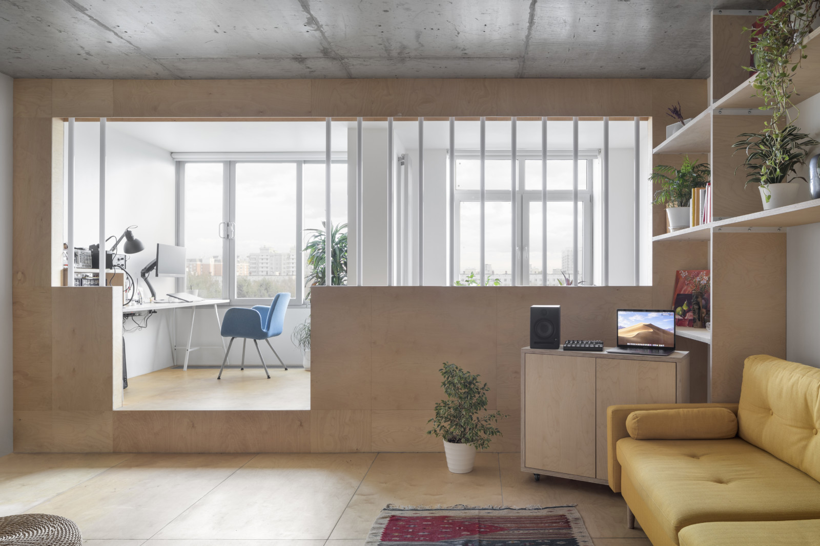 On entre dans l’appartement. Directement sur la gauche, la cuisine, ouverte et fonctionnelle. L’ensemble des éléments a été conçu sur mesure, dans un contreplaqué de bouleau. Le ton est donné !