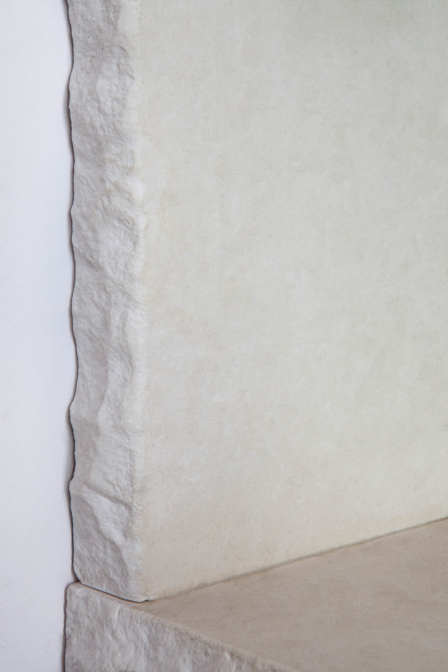Le plan de travail est en calcaire vieilli, aux tranches non usinées. L’idée est de respecter au mieux l’apparence et les textures originelles des matériaux.