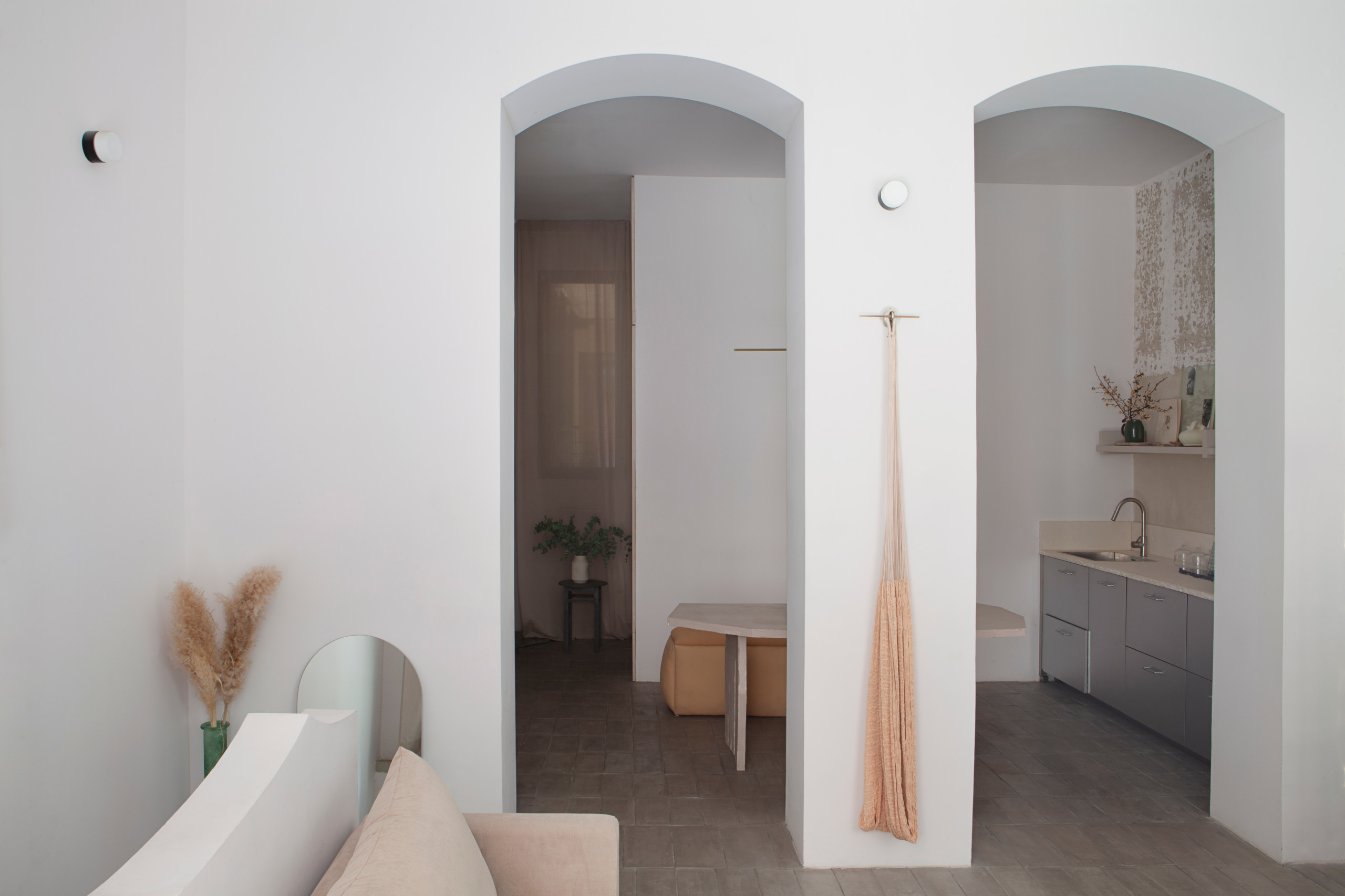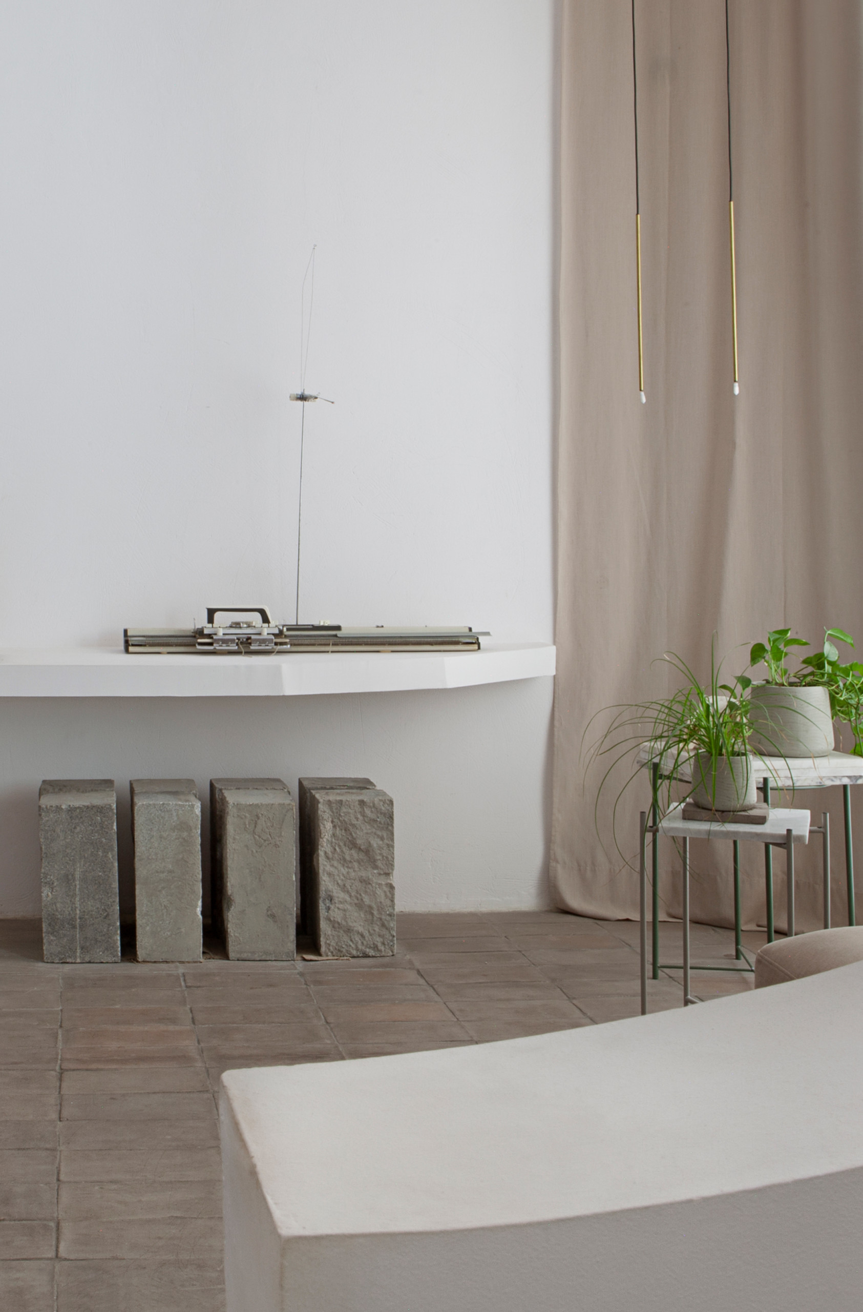 La plupart des pierres naturelles ont été récupérées lors des travaux de rénovation et sont utilisées en alternance dans l’espace, pour créer des tables basses et des présentoirs.
