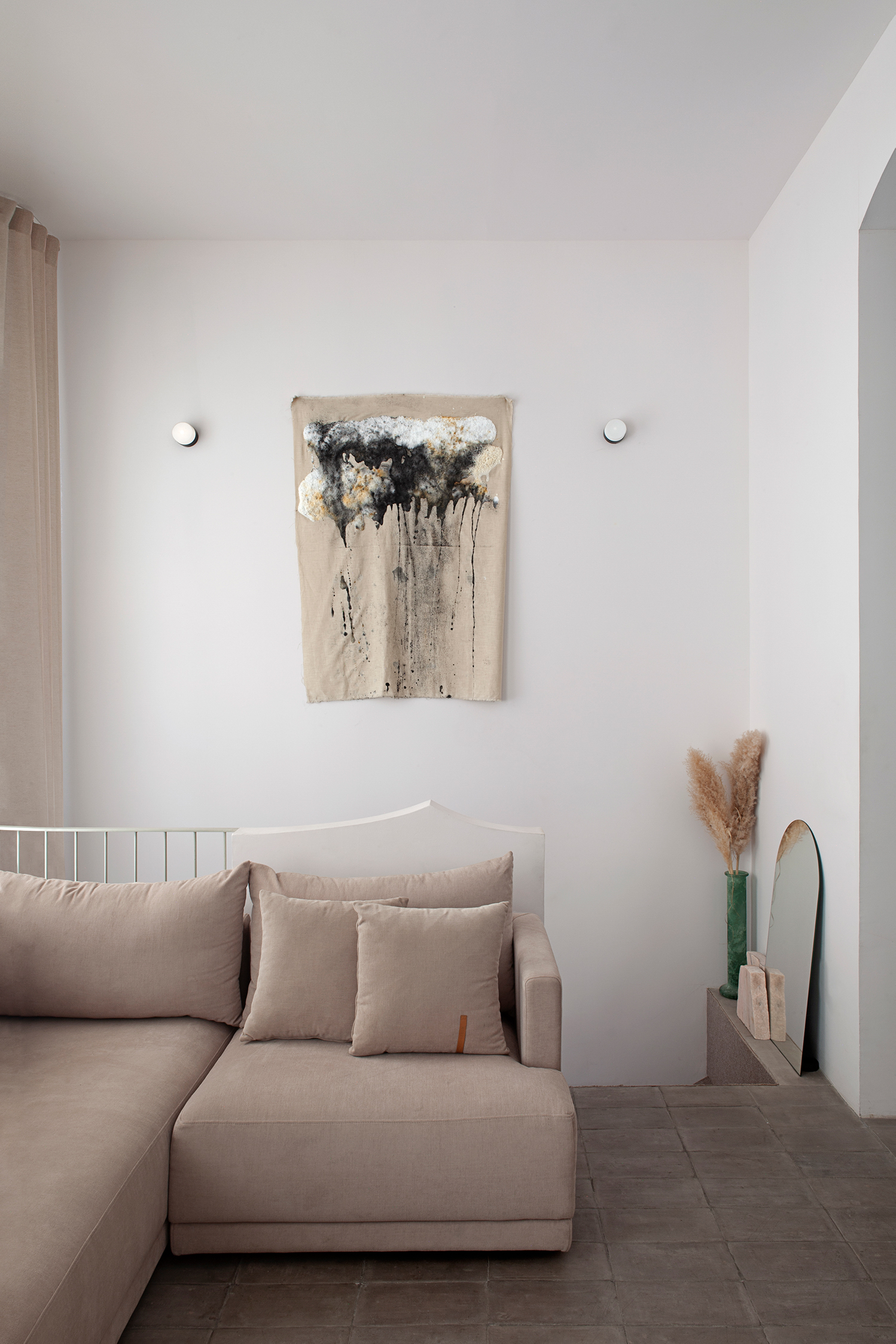 La palette de tons terre et les textiles nous accompagnent encore au moment de descendre vers la chambre. Le sommet du garde-corps se veut lui aussi sculptural.