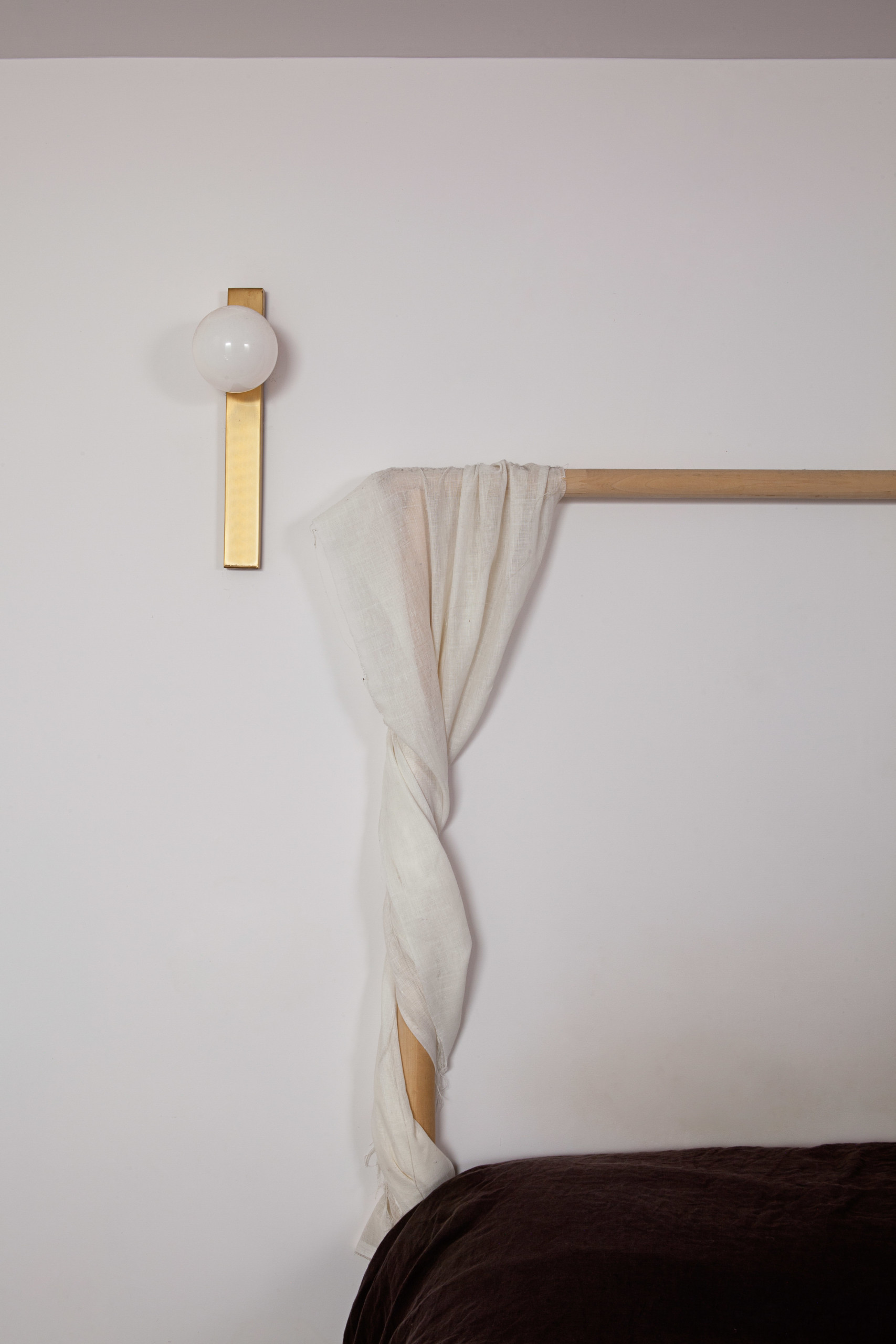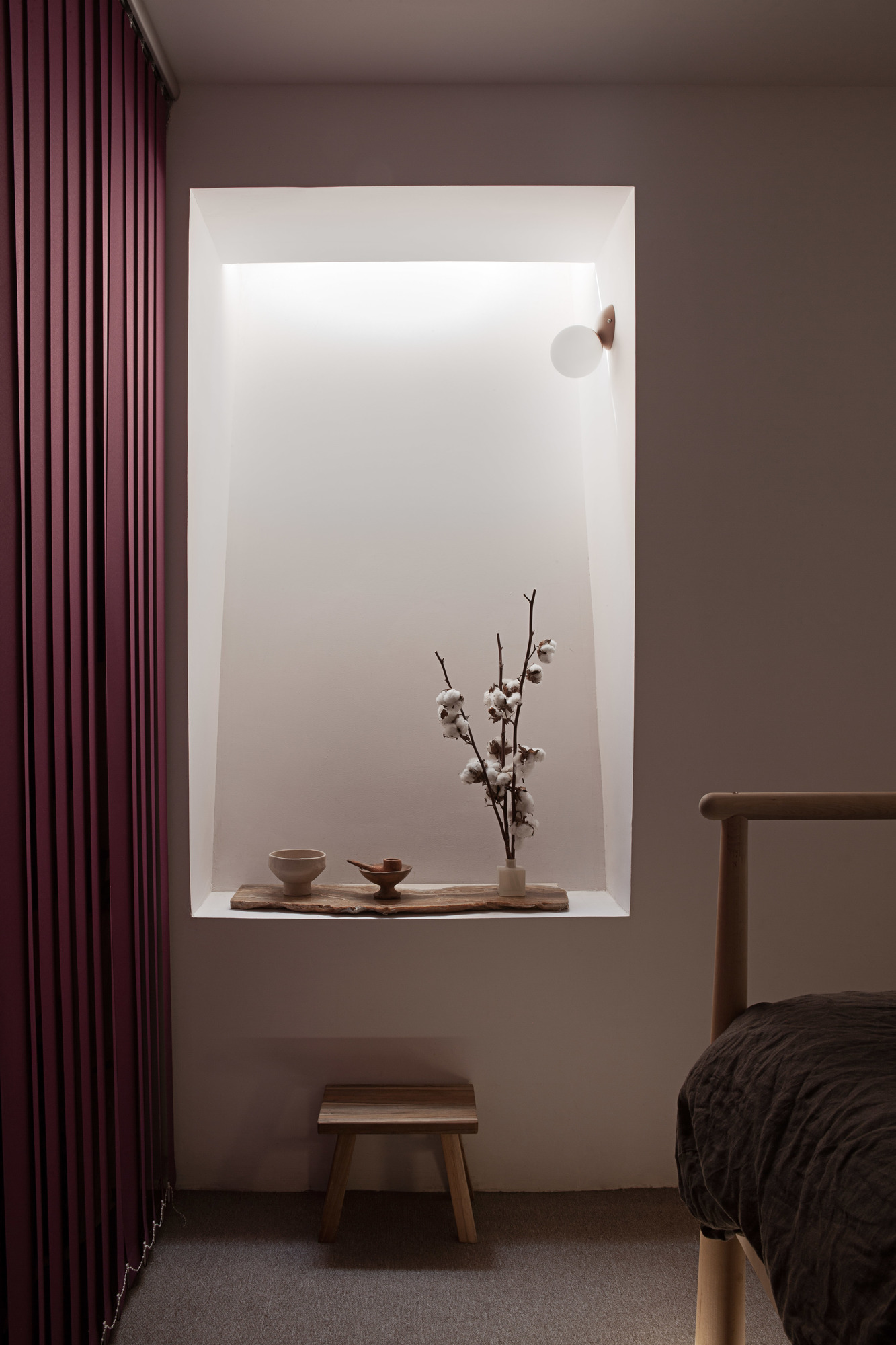 On retrouve le dialogue subtil entre géométries pures et tissus jusque sur cette tête de lit minimaliste.