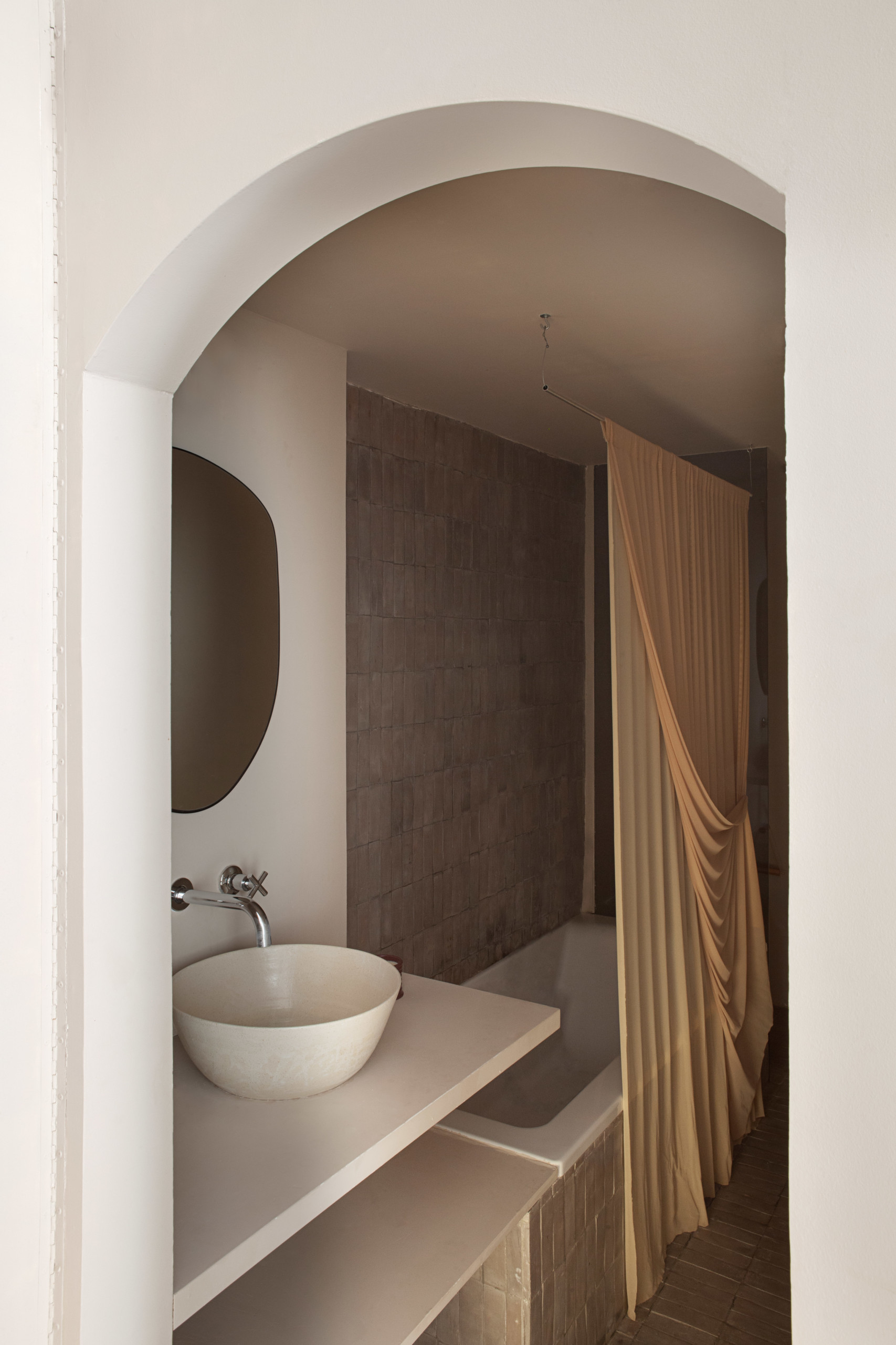 La salle de bain nous plonge dans une atmosphère intime et chaleureuse grâce au jeu d’ombres douces et au rideau, création unique inspirée des sensations tactiles de la peau.