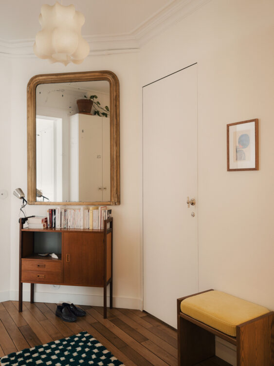 L’entrée, ponctuée de meubles vintage et d’un miroir ancien, donne le ton du projet en mêlant subtilement styles et époques.