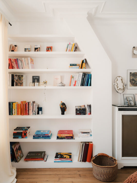 L’agence exploite le conduit de cheminée en coude pour intégrer des étagères blanc sur blanc, privilégiant les éléments ouverts et offrant des rangements sans alourdir l’espace.