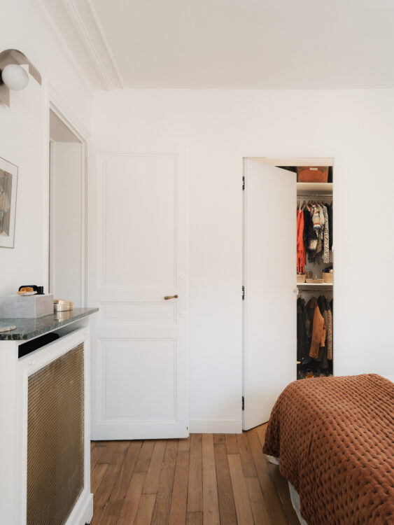 Un grand dressing prend place à l’emplacement de l’ancienne salle de bains, optimisant les rangements, tandis qu’un radiateur ancien restauré se fond derrière un panneau ajouré canné, mêlant charme patrimonial et fonctionnalité.