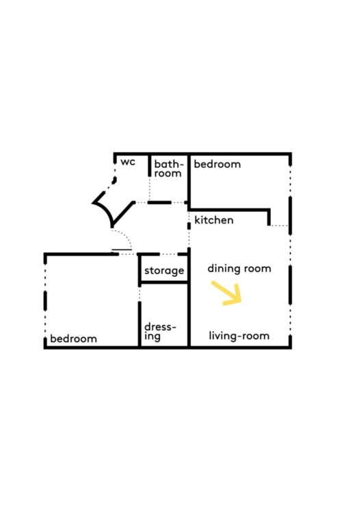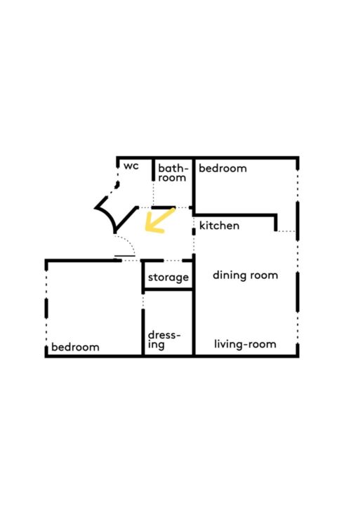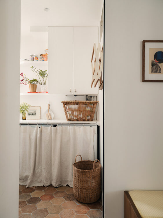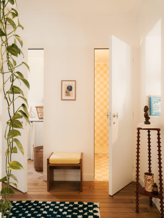 Dans l’entrée, deux portes côte à côte mènent à la buanderie-sanitaires et à la salle d’eau. Dans cette dernière, les carreaux répondent au motif du tapis, créant un dialogue graphique subtil qui rythme l’espace dès le seuil de l’appartement.
