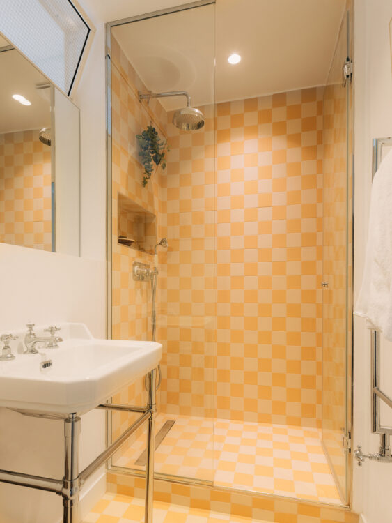 La salle d’eau est éclairée et ventilée en second jour par une petite fenêtre en hauteur. Une vasque vintage en faïence se détache sur des carreaux jaunes citron, qui apportent chaleur et éclat à l’espace.