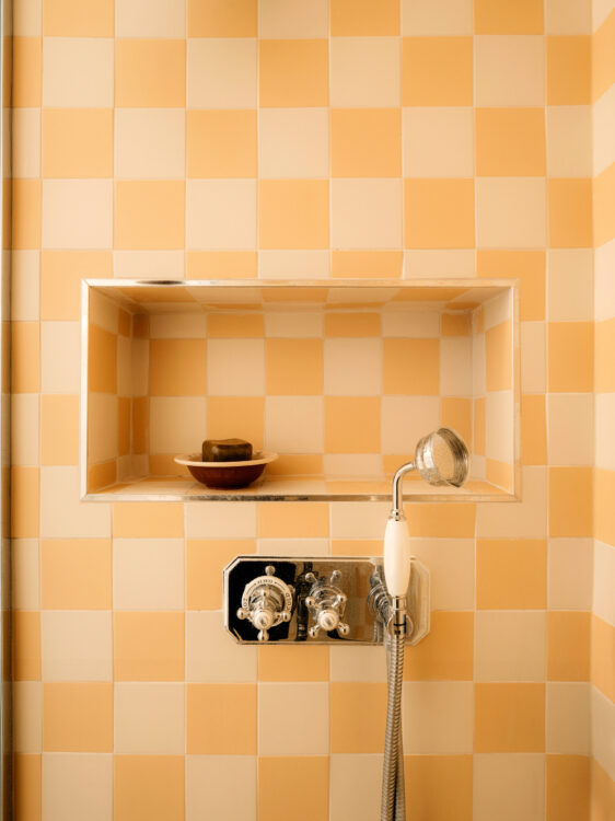 Dans la douche, une niche intégrée accueille les produits du quotidien, tandis que la robinetterie à l’ancienne ajoute une touche rétro et élégante.