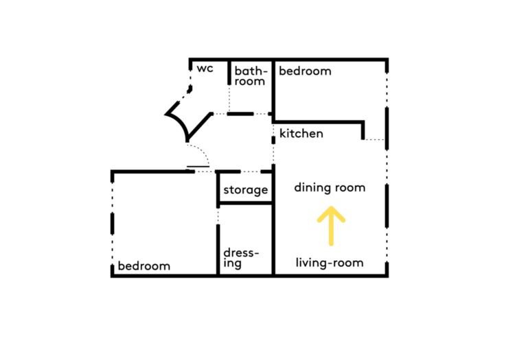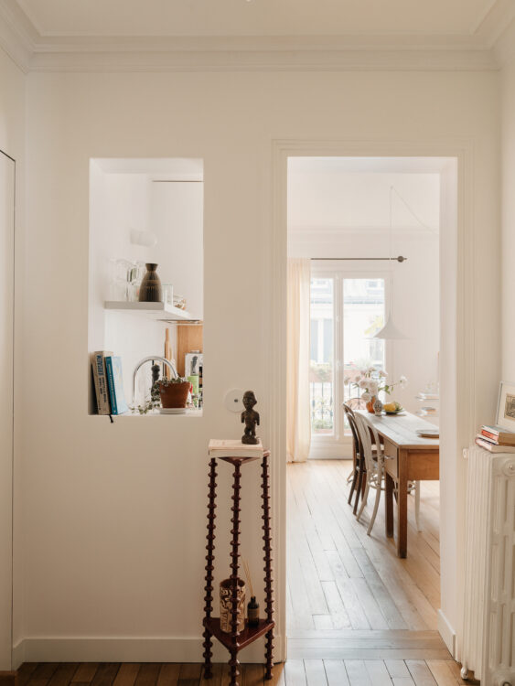 Depuis l’entrée, le regard se prolonge naturellement vers la pièce de vie. Sans porte, l’espace gagne en fluidité, alors qu’une niche ouverte agit comme une fenêtre intérieure, offrant un aperçu de la cuisine. Le parquet en chêne se prolonge, unifiant visuellement l’ensemble.