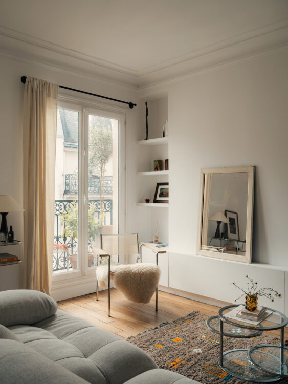 Côté salon, ambiance cocooning assurée : canapé bas et moelleux, chaise recouverte d’une peau en laine et tapis épais invitent à la détente. Un meuble bas intégré, sur lequel repose un miroir, crée un lien visuel subtil entre le salon et la cuisine, prolongeant l’espace avec légèreté.
