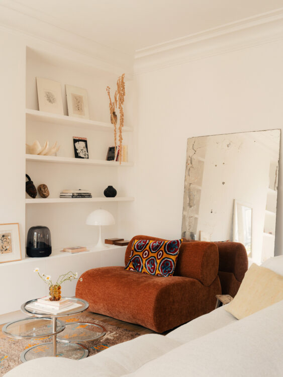 Face aux fenêtres, un miroir vieilli reflète la lumière naturelle. De grandes étagères ouvertes structurent l’espace, tandis que le fauteuil couleur brique contraste avec la blancheur épurée des murs, apportant chaleur et caractère à la pièce.