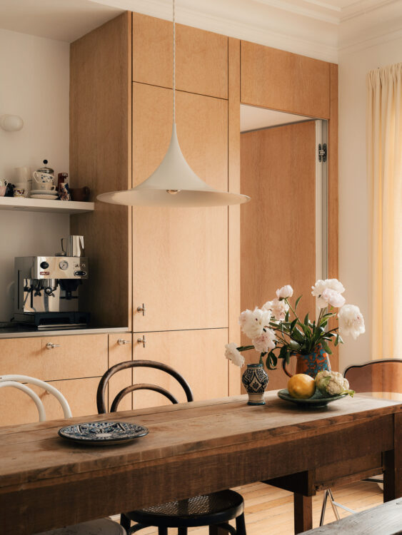 La cuisine s’étire en longueur entre le mur de l’entrée et deux éléments toute hauteur le long de la façade. La chaleur du bois domine et confère à l’espace une atmosphère accueillante.