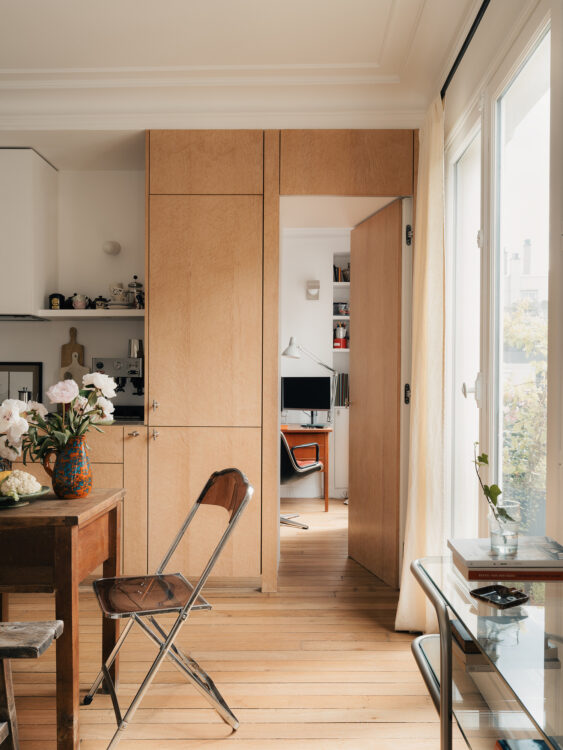 Derrière ce qui semble être une simple porte de placard, se cache l’accès discret à un bureau ou une chambre d’amis selon les besoins. Un subtil jeu d’astuces d’aménagement qui optimise l’espace.
