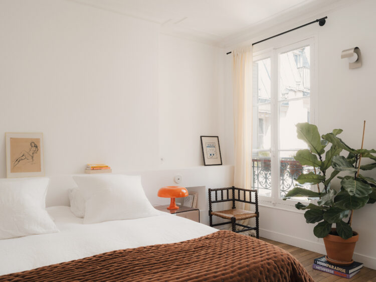 La chambre baigne dans la lumière, avec un parquet en chêne ancien restauré et une tête de lit sur mesure intégrant des niches.