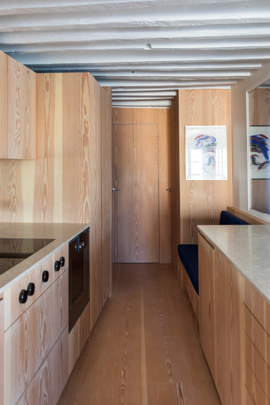 Changement de décor dans la cuisine qui se pare d’un parquet en Douglas, reproduit en placage sur les façades de la cuisine.