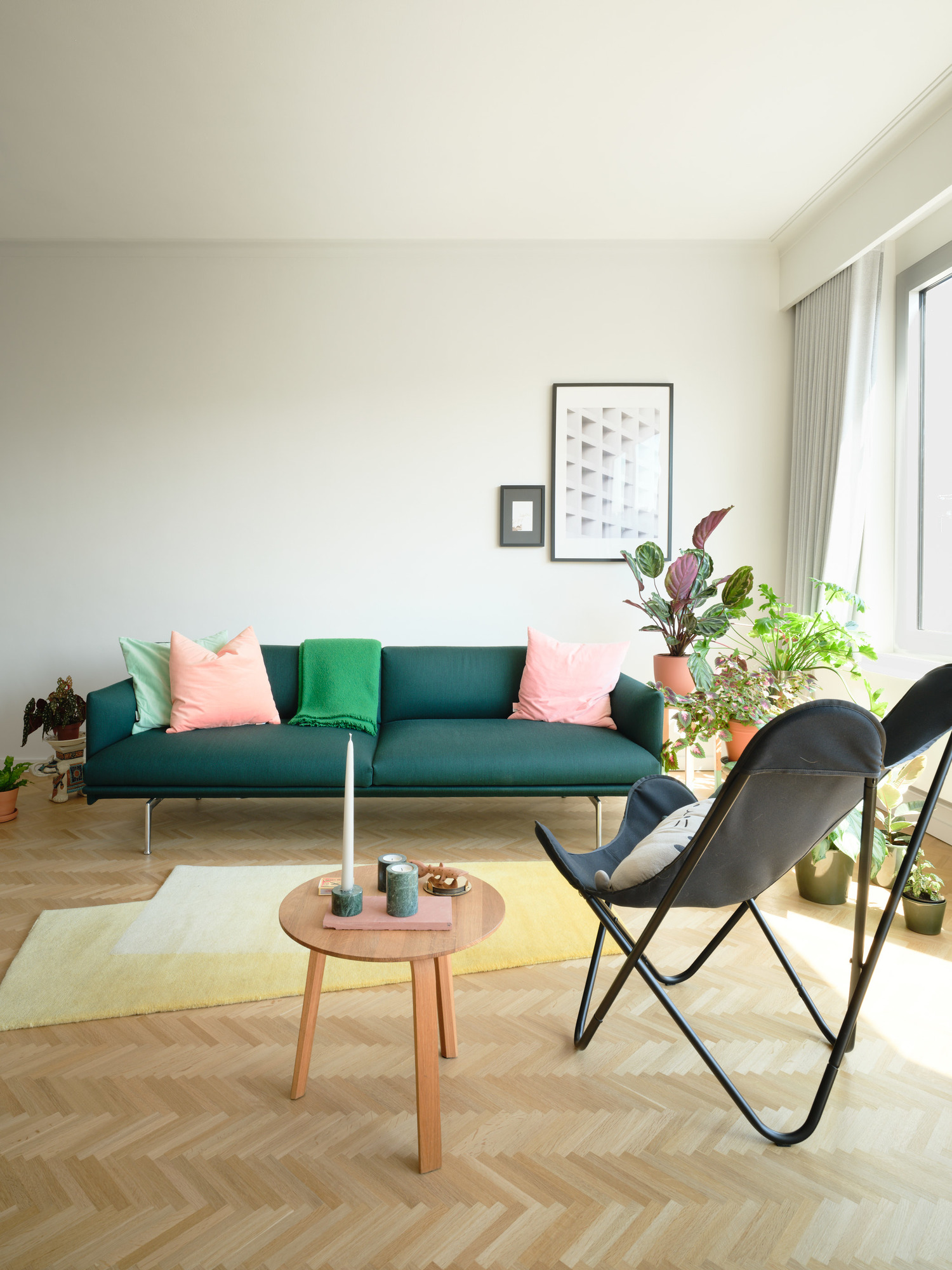 L’écrin clair et neutre offre une toile parfaite pour jouer avec les couleurs et les textures. Dans le séjour, ce sont les matières naturelles, comme le bois et les teintes végétalisées, qui sont mises en avant.