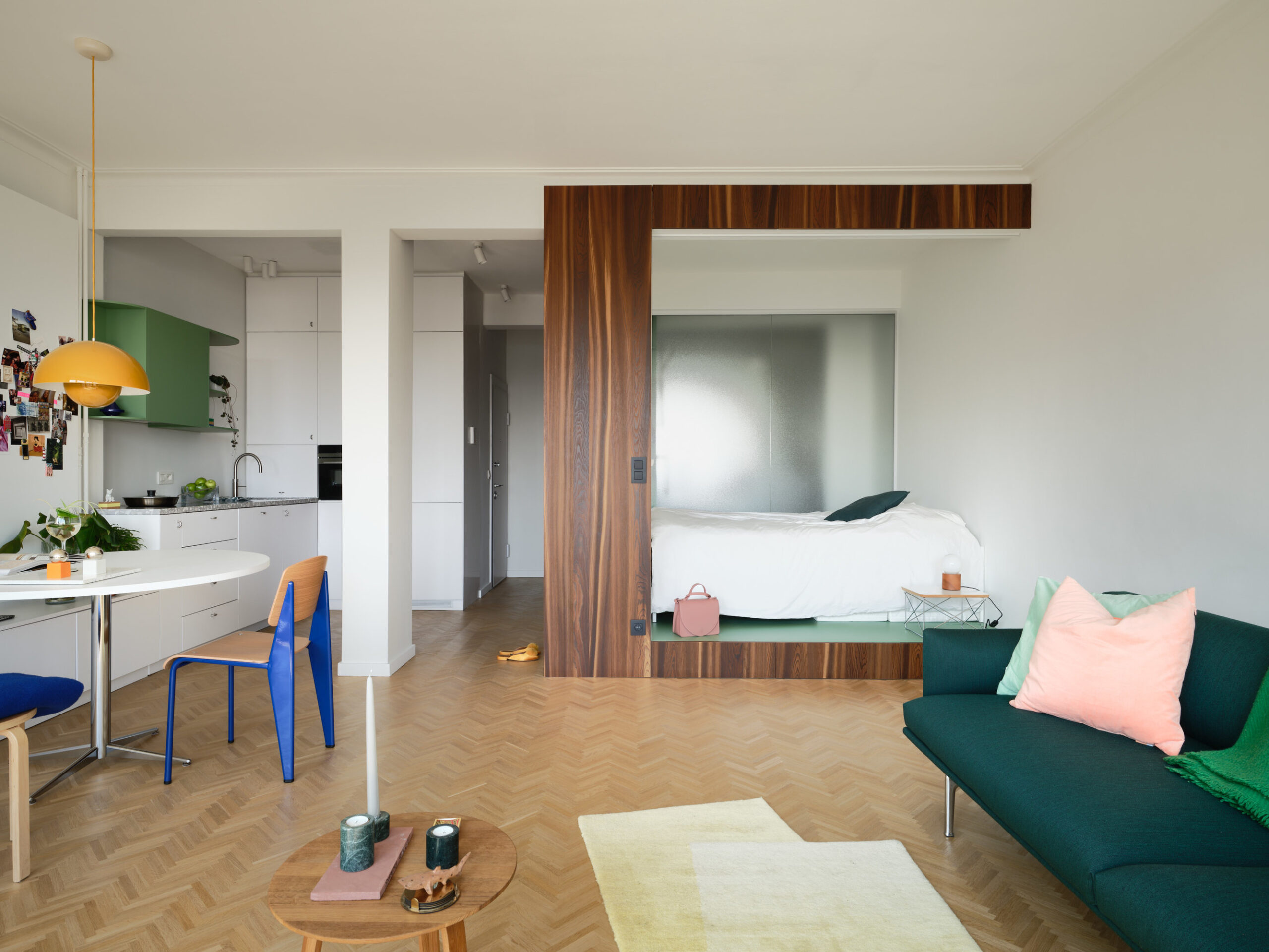 Cette alcôve est un élément central du projet. Elle structure la circulation et l’organisation du studio, tout en dissimulant de nombreux rangements.