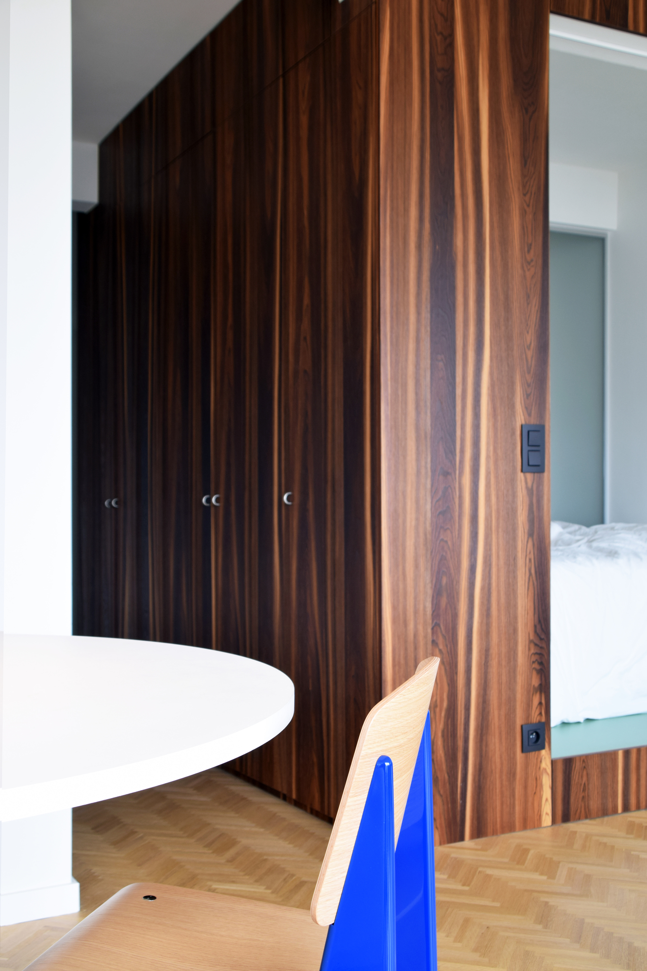 Les assises en bois clair, telle que la chaise écolier de Jean Prouvé, résonnent avec le parquet en point de Hongrie et rehaussent les lieux de leurs touches bleutées.