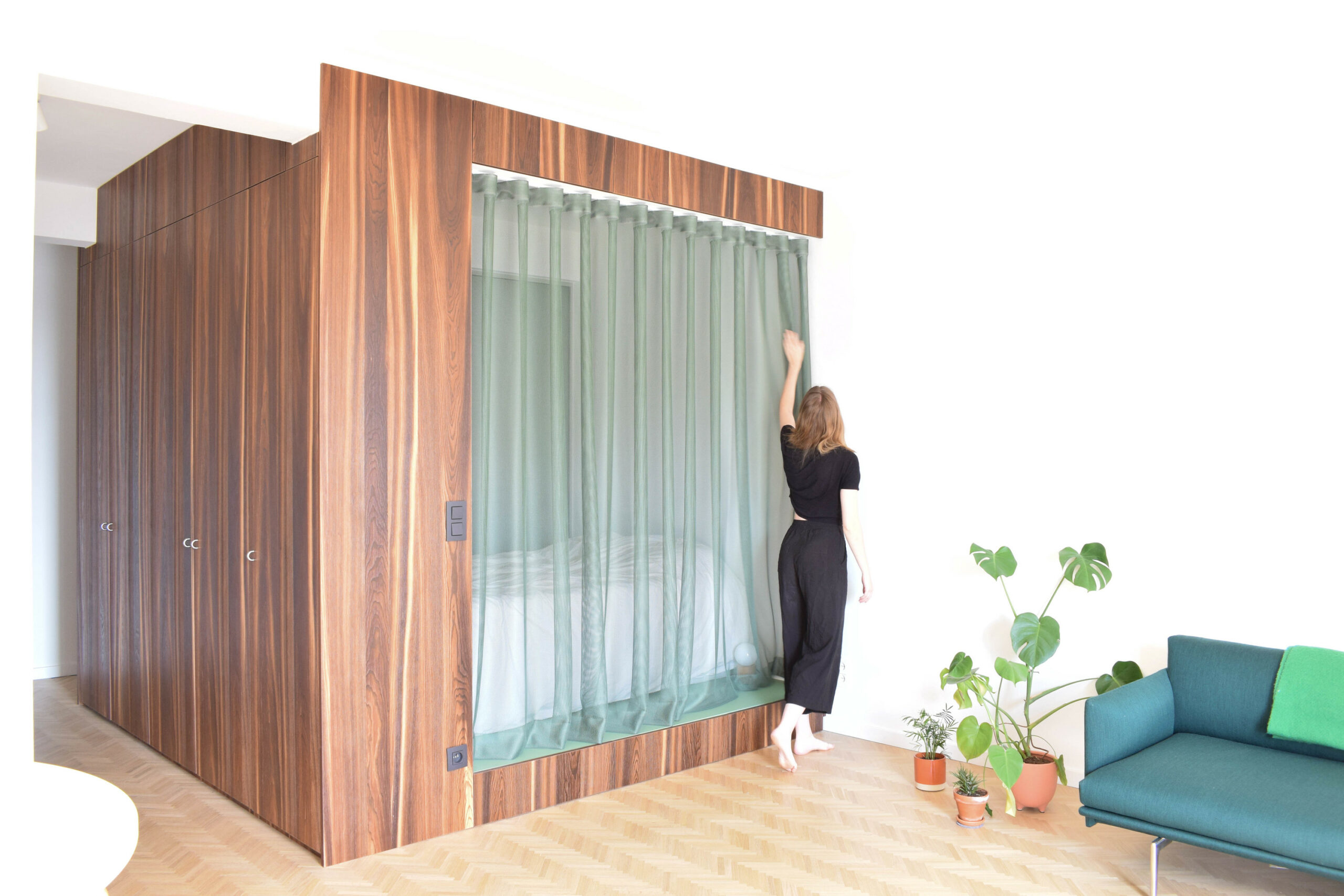 Pour créer un vrai cocon intime, un rideau semi-opaque aux nuances vertes vient camoufler l’espace nuit.