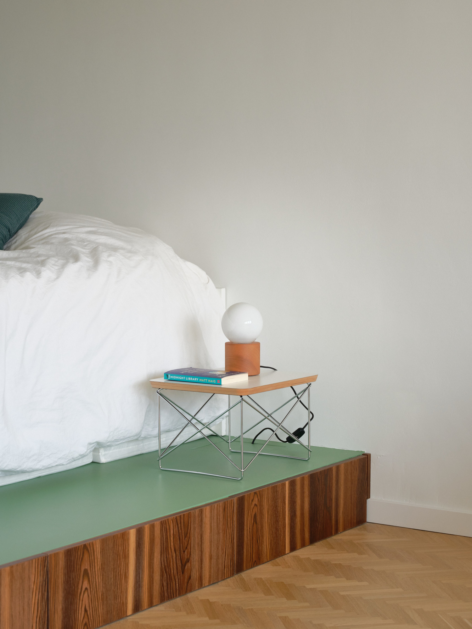 L’estrade du lit reprend la couleur vert olive. Une teinte comme un fil conducteur pour relier les différents espaces du studio.