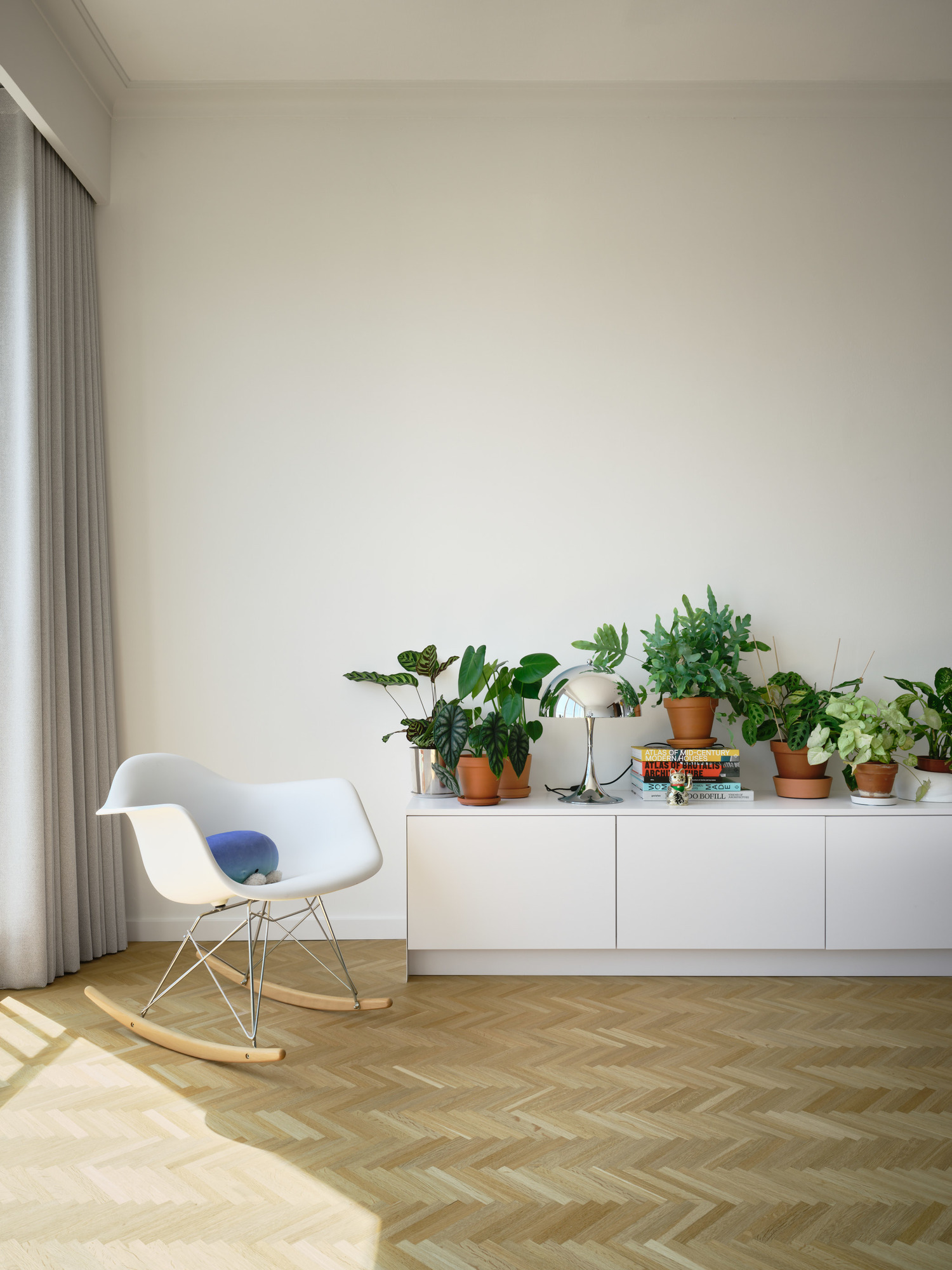 En face du coin séjour, l’architecte imagine un espace de rangement composé d’un meuble bas afin d’apporter de la perspective et de laisser filer la lumière. La végétation se mêle à du mobilier moderne, comme la lampe argentée de l’éditeur Louis Poulsen.