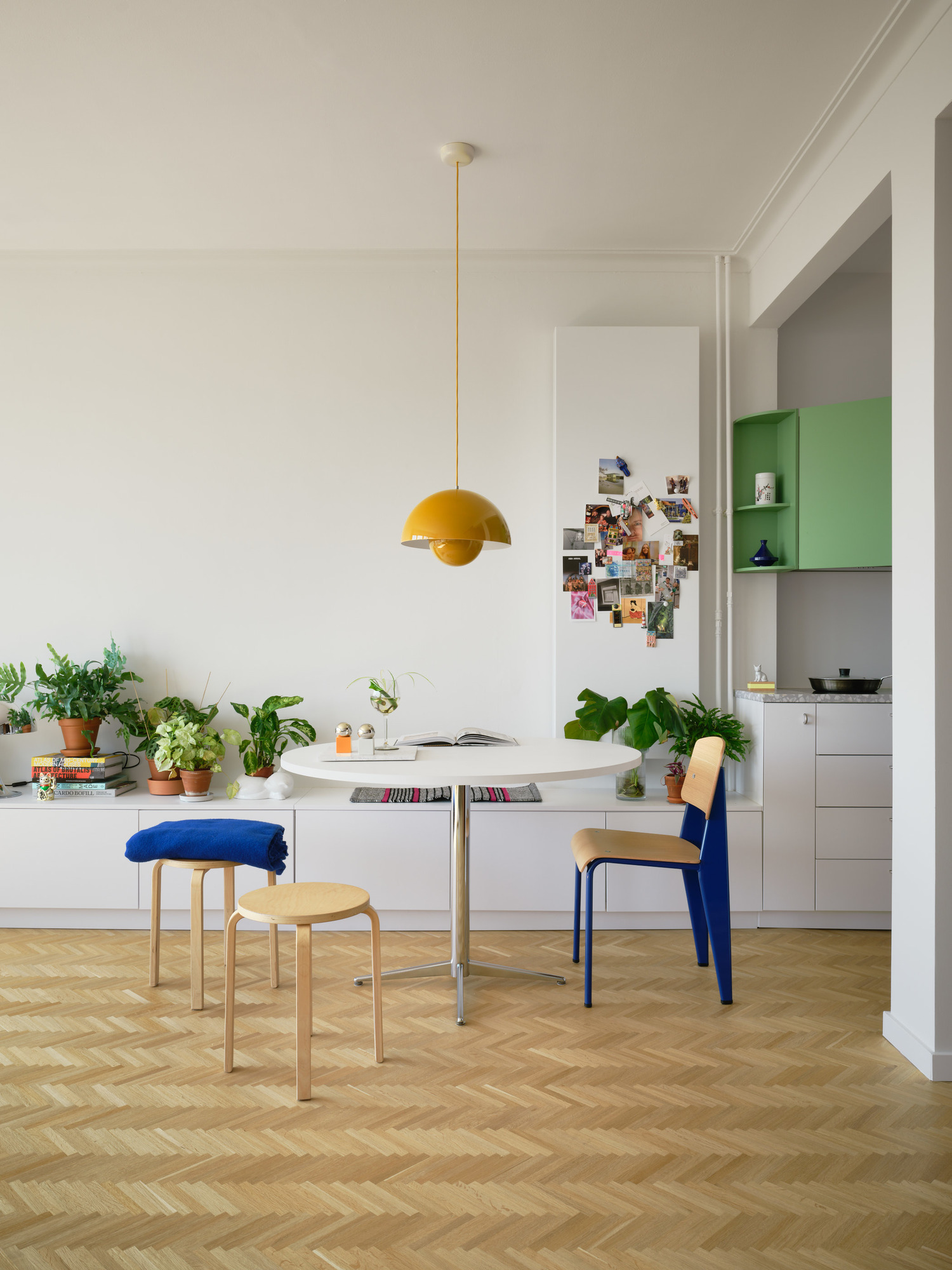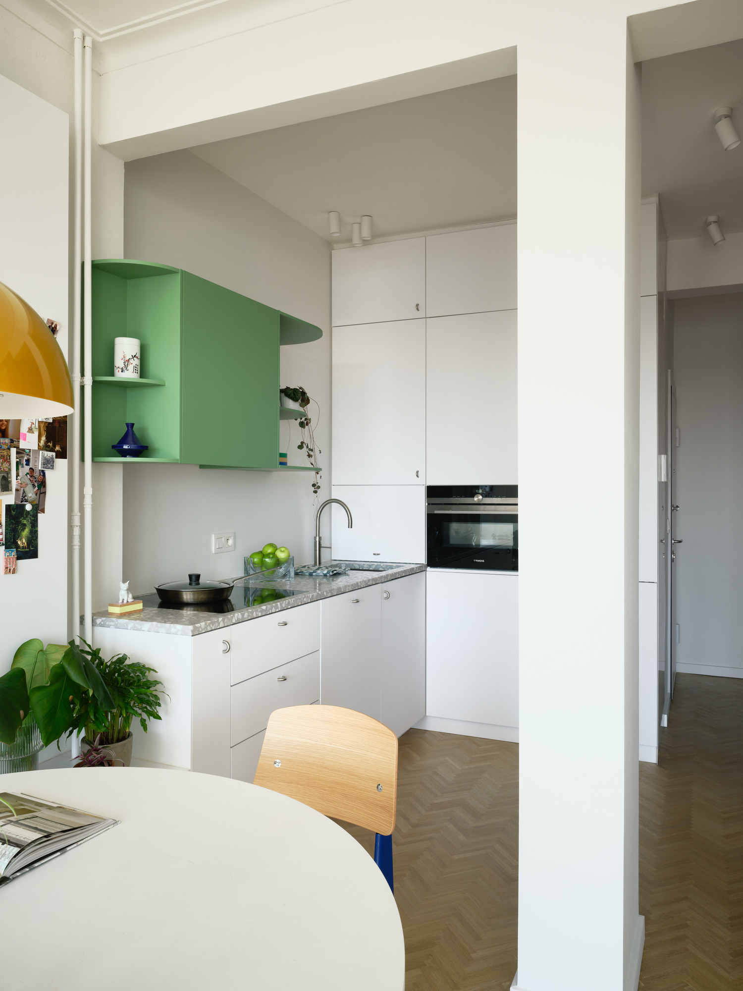 Comme un rappel, le vert s’invite aussi dans la cuisine, avec une étagère incurvée qui ressort avec fantaisie dans ce volume d’un blanc éclatant.