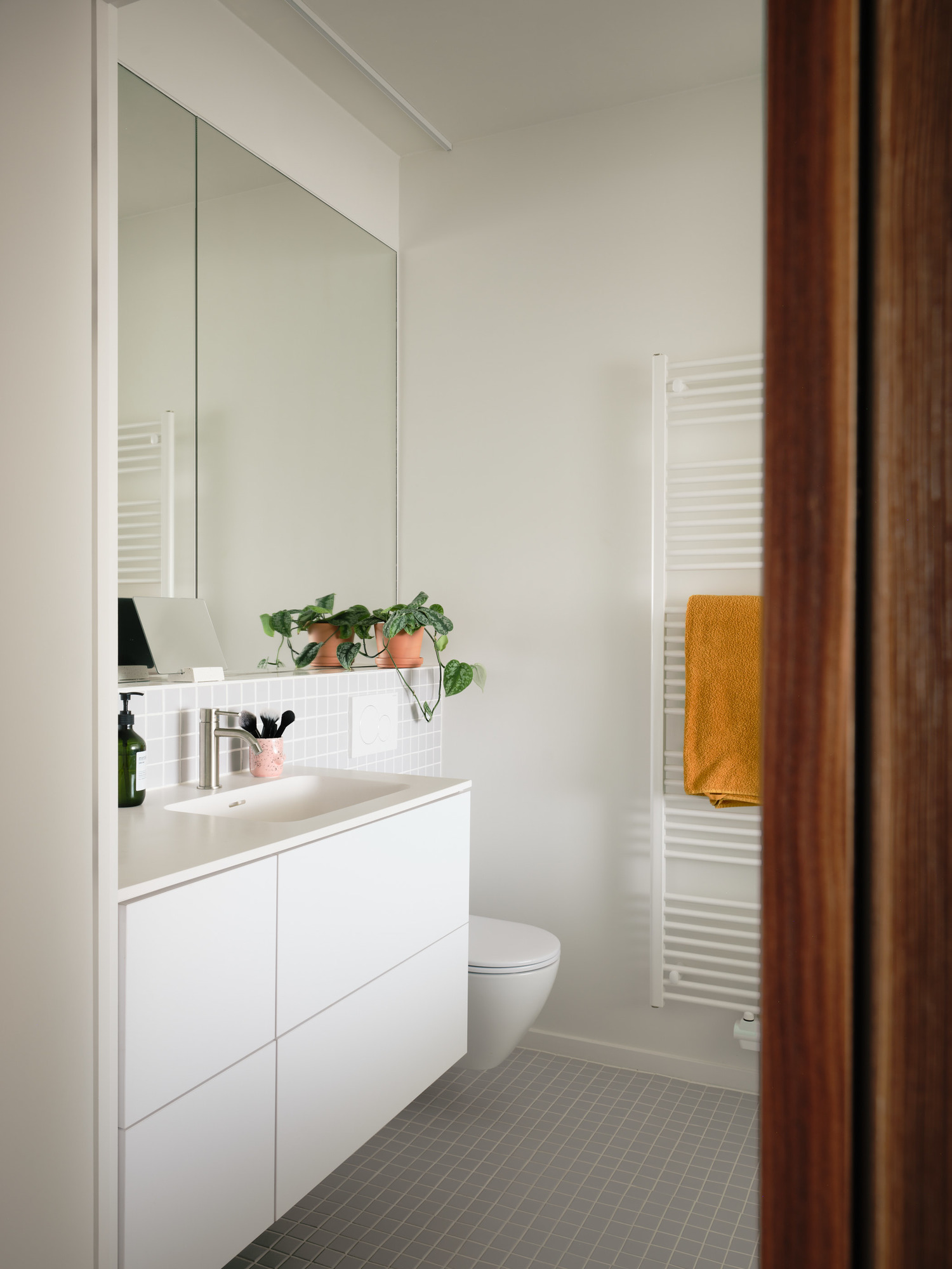 Dans ce décor blanc, le vert se faufile à nouveau. Il envahit ainsi l’espace douche et rappelle les étagères incurvées de la cuisine via la petite niche où se logent des produits de beauté.