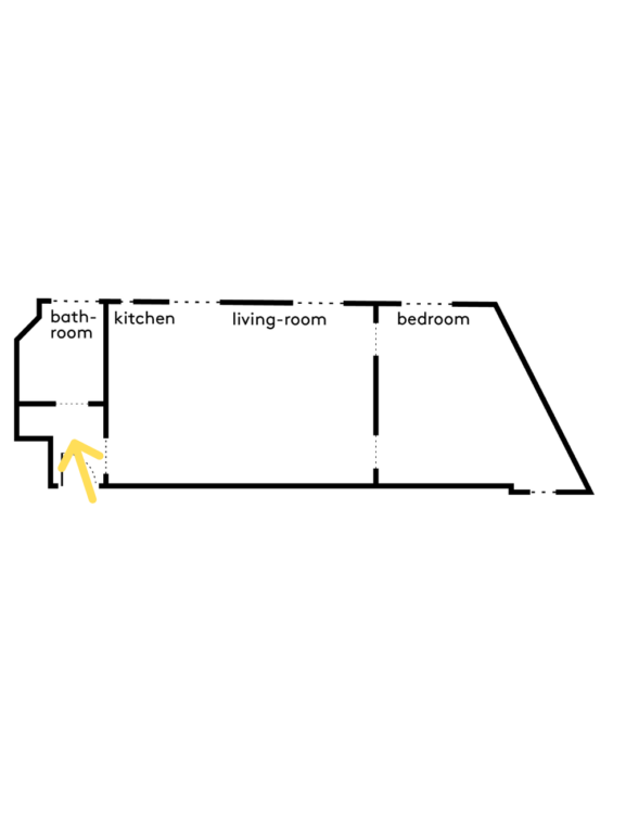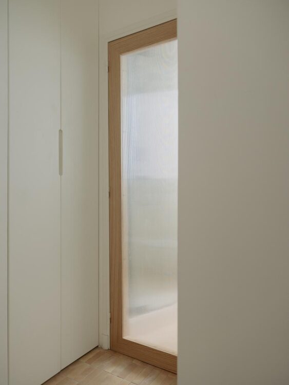 Dans l’entrée, des rangements muraux s’intègrent naturellement, tandis qu’une première porte en verre strié laisse filtrer la lumière. Ouvrant sur la salle d’eau, elle en préserve néanmoins l’intimité.
